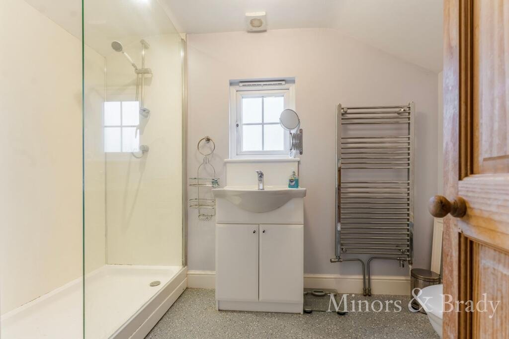 Stairs lead to the first floor, where three bedrooms are arranged off the landing. The main bedroom is a comfortable double room with space for wardrobes and bedroom furniture. Bedroom two is another generous double and benefits from its own en suite shower room, fitted with a shower enclosure, wash basin, WC and heated towel rail. The third bedroom offers flexibility and would suit use as a bedroom, home office or dressing room.