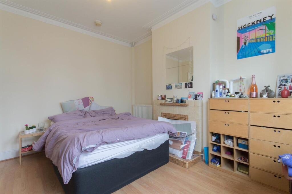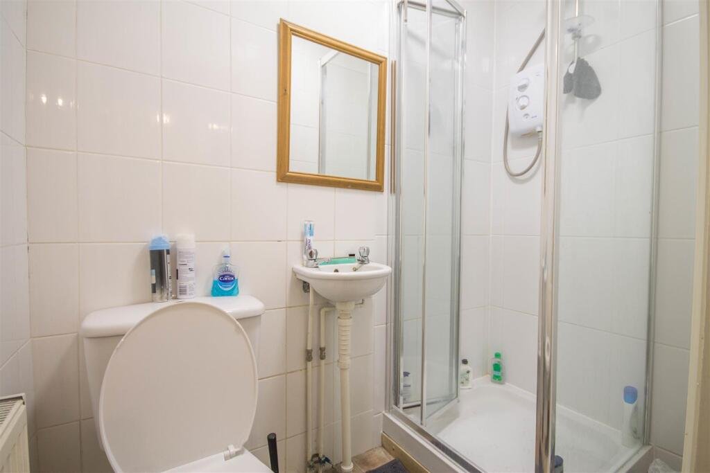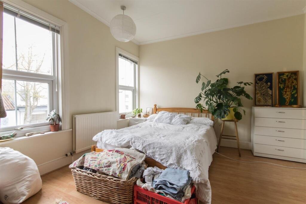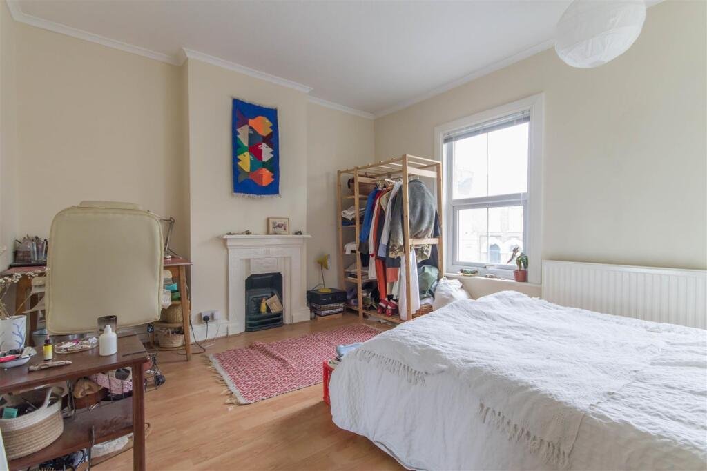 The ground floor comprises a spacious double bedroom, a comfortable communal living room, a fully equipped kitchen, and a bathroom. From the kitchen there is direct rear access to a large back garden, which includes useful storage and side access leading through to the street.
