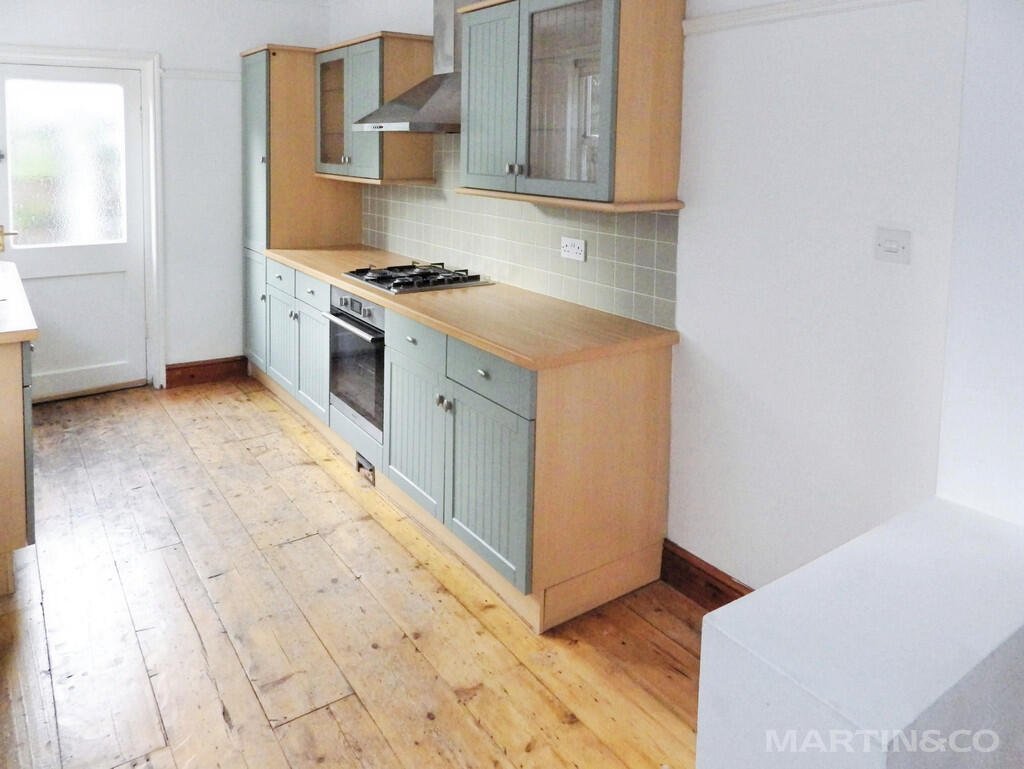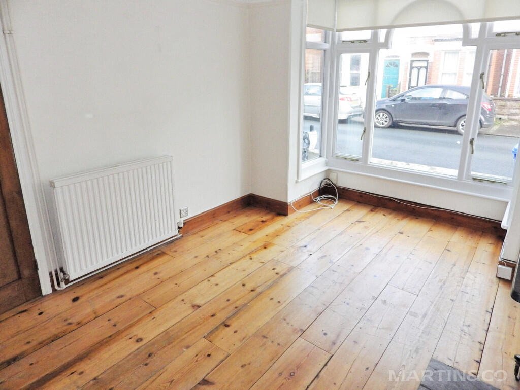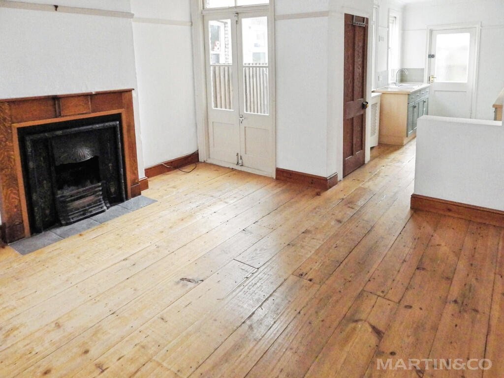 The property offers two reception rooms: a separate reception with large windows and wood floors, and a further open-plan reception space, also with wood flooring, providing flexible living and dining options. The neutrally decorated interior allows for a range of furnishing styles. The kitchen benefits from good natural light. Upstairs are two double bedrooms and one single bedroom, along with a bathroom.