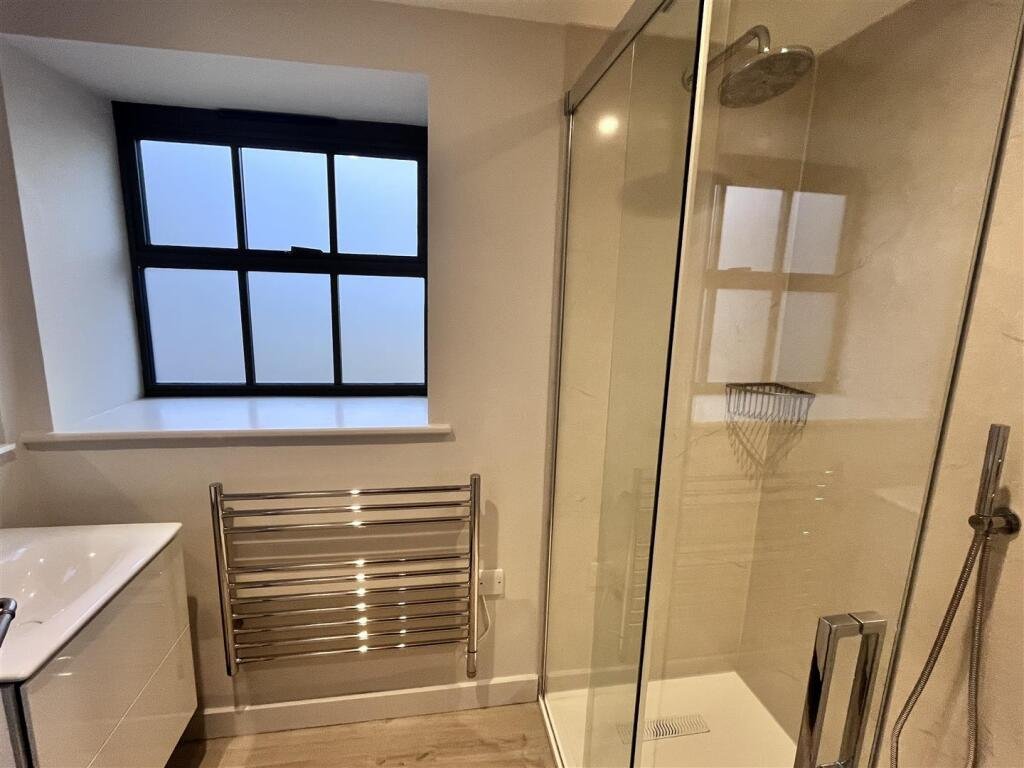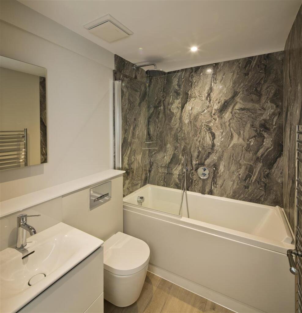 Bathroom – Panelled bath with freestanding separate handset shower unit, low flush WC and vanity hand basin with mixer tap and automated mirror above. Heated towel rail. Extractor fan and inset ceiling spotlights.