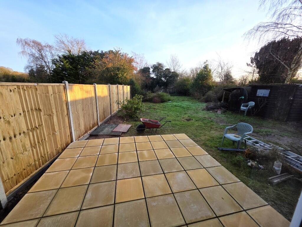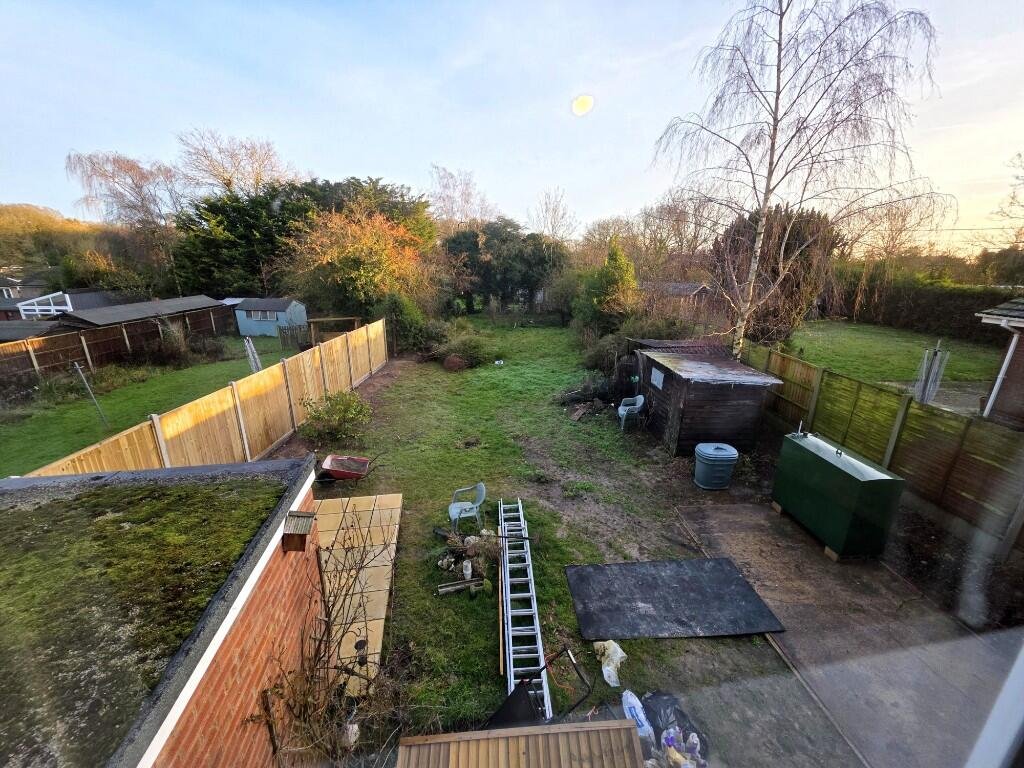 To the rear – oil tank for the central heating. The rear area of the garden has established grass and is well screened by hedges and fences to all sides. Shed and hard area.
