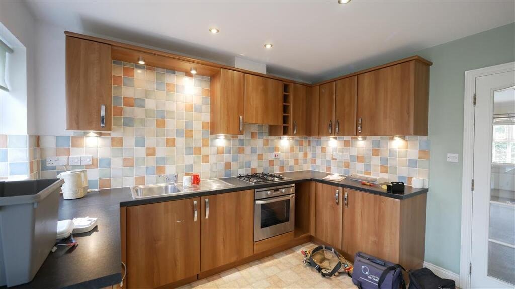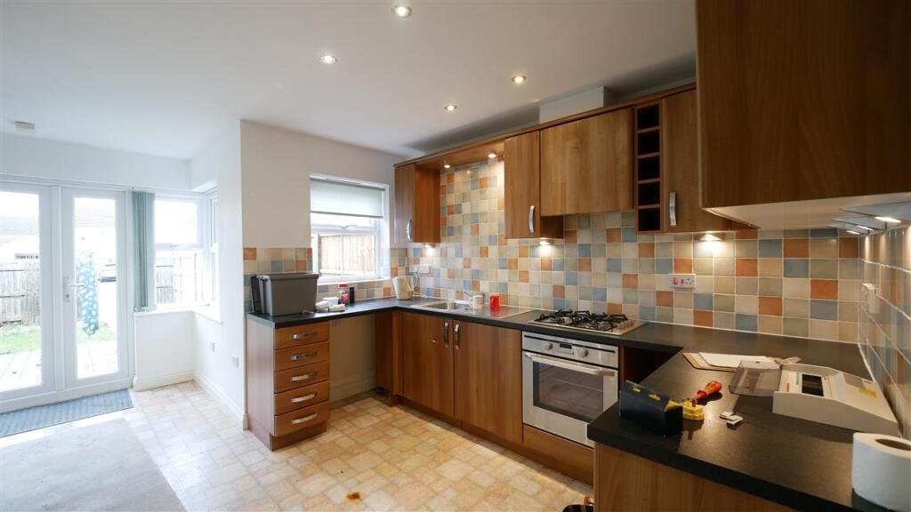Kitchen/Dining Room 4.97m (16′ 4″) x 4.52m (14′ 10″)Range of fitted units with built-in gas hob, oven and extractor hood. Space for washing machine and fridge/freezer. Double doors to rear garden