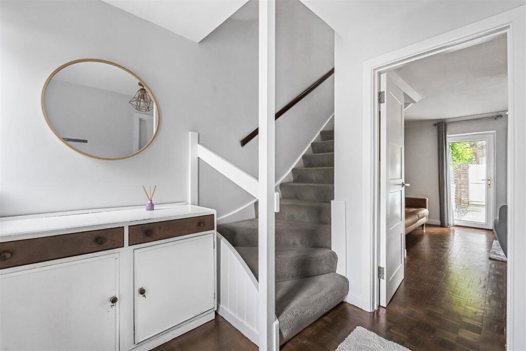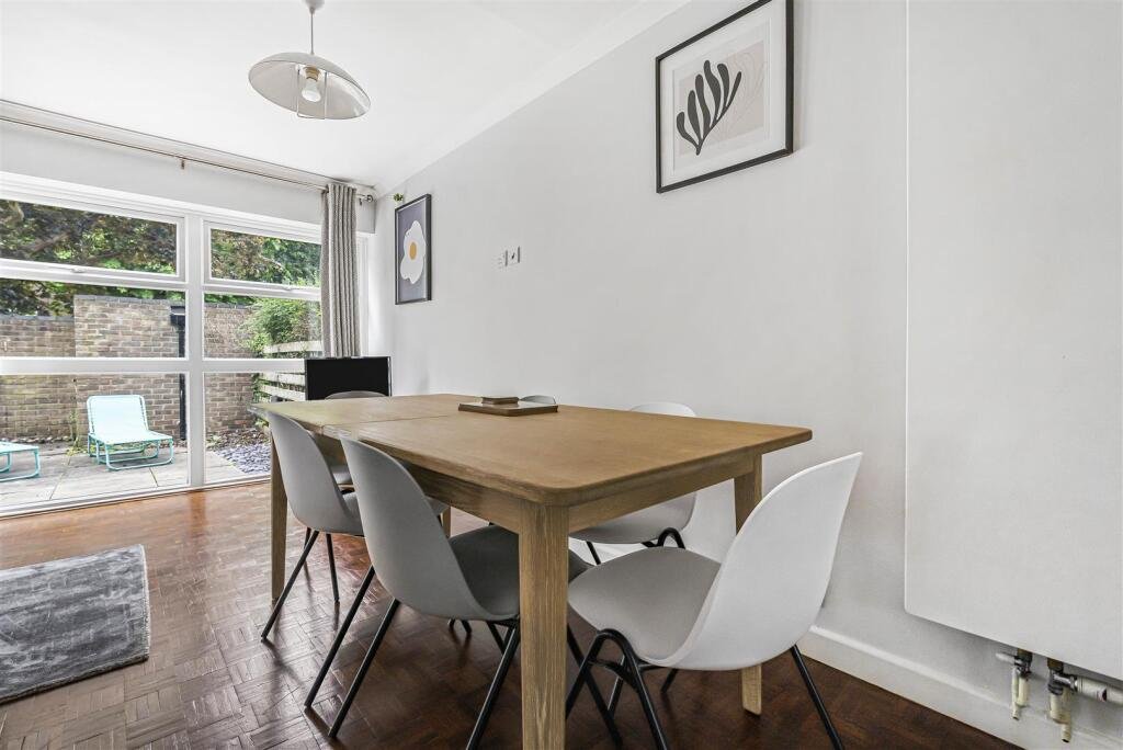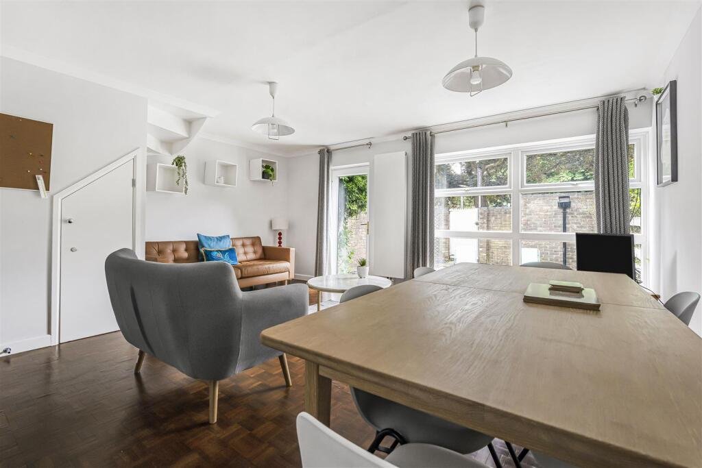 for a washing machine and dryer. The kitchen opens into the living room, which benefits from excellent natural light, attractive parquet flooring, useful under stair storage and direct access to the rear garden.