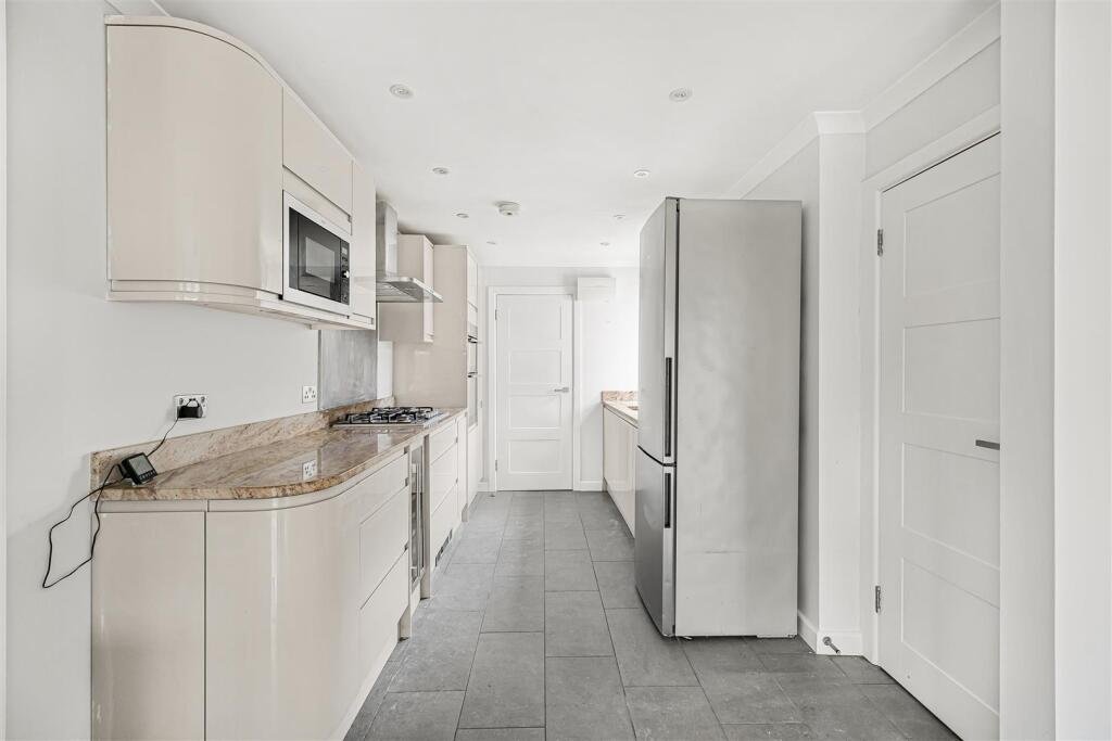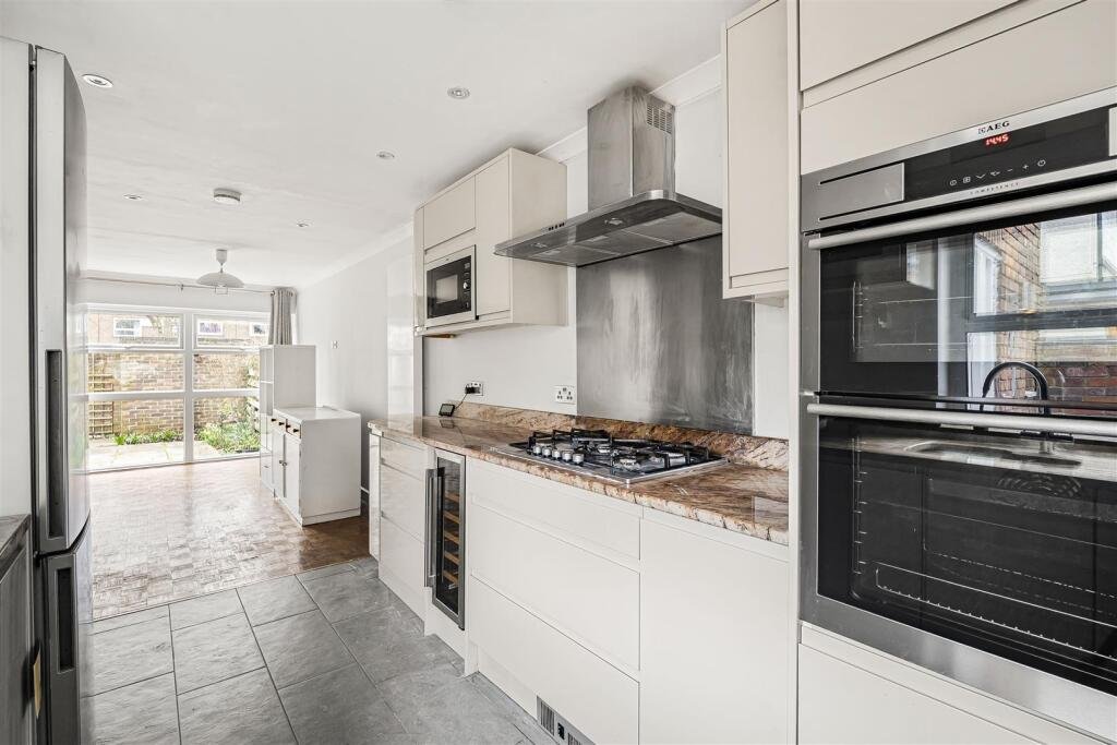 The property offers approximately 1,095 sq ft of well arranged accommodation set over three floors. On the ground floor, a spacious entrance hallway leads through to a recently refitted kitchen with extensive cupboard space, granite worktops and a range of integrated appliances including a waist height oven and grill, five ring gas hob, microwave, wine cooler and dishwasher. There is space for a fridge freezer, and a separate utility cupboard provides space