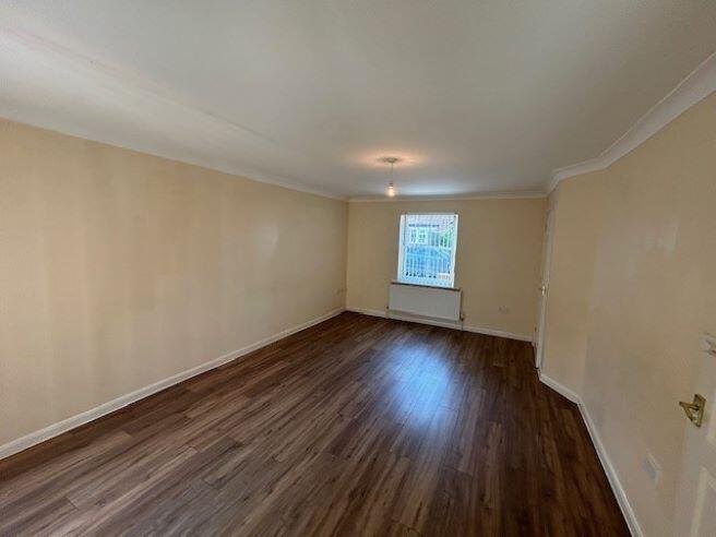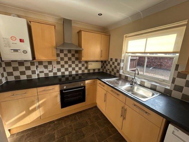 Kitchen with integrated electric oven and hob with extractor hood above. Downstairs WC, Lounge with hard flooring and patio doors through to rear garden.