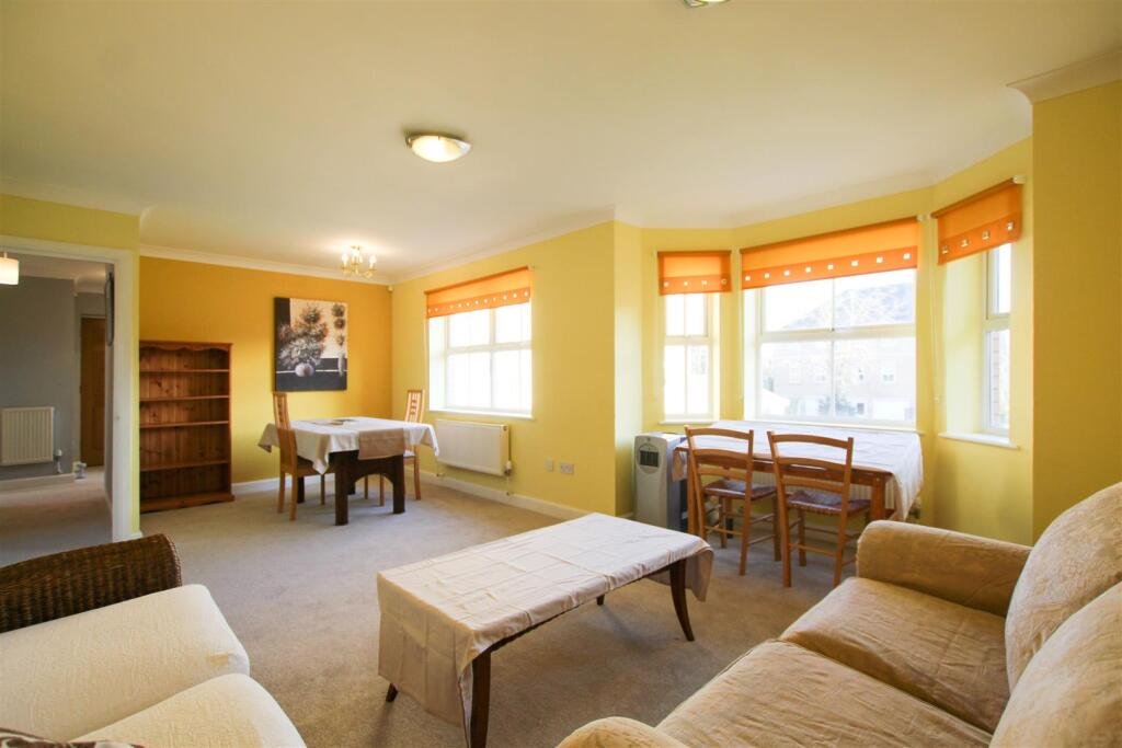 Living Room – bay window to front aspect, further window to front aspect and furniture comprising dining table with chairs, shelving unit, 2 sofas, coffee table, side table and desk.