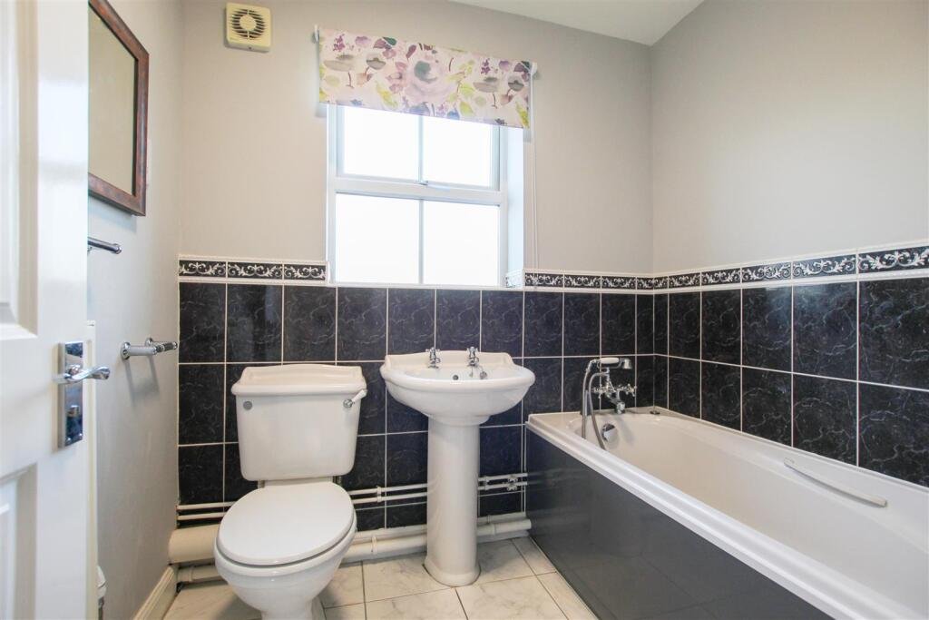 Bathroom – bath, wc, wash basin and window to rear aspect.