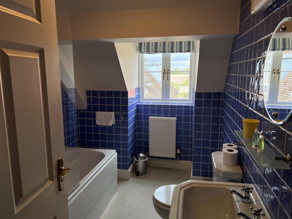 Bathroom – With casement window and fully tiled walls. Suite comprising panel bath with gravity fed shower over and screen, pedestal hand wash basin and WC. Radiator.