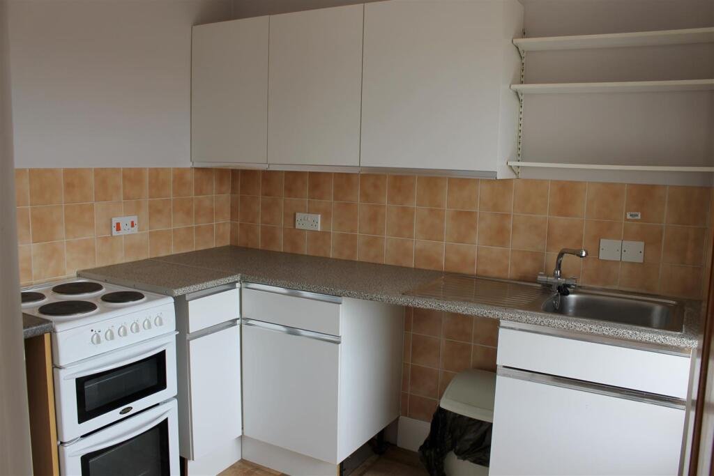Kitchen – Window to Front, Vinyl Flooring, Wall and Base Units, Stainless Steel Sink and Drainer, Sockets,