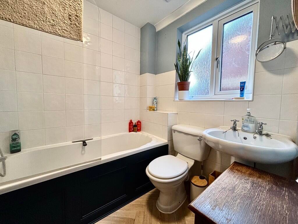 Bathroom Three piece suite comprising of panelled bath with mixer shower above and glass screen, low level WC and washbasin with fitted cupboards beneath, cushion vinyl flooring, ladder radiator, side facing double glazed window with frosted glass.
