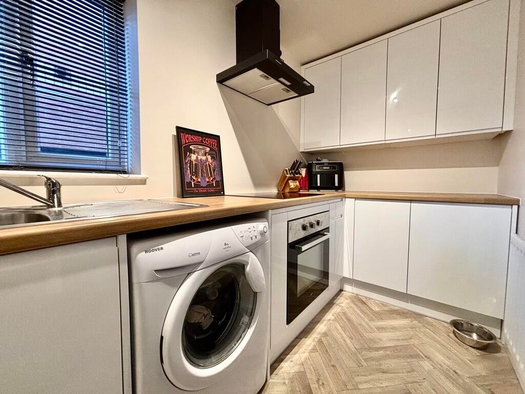 Kitchen Fitted gloss effect base/drawer units and wall mounted cupboards, stainless steel 1.5 bowl sink unit with mixer tap inset into wooden effect worktop, electric cooker with 4-ring ceramic hob, wall mounted gas fired boiler, Herringbone effect flooring, side aspect uPVC sealed unit double glazed windows with blinds. Discuss appliances with agent.