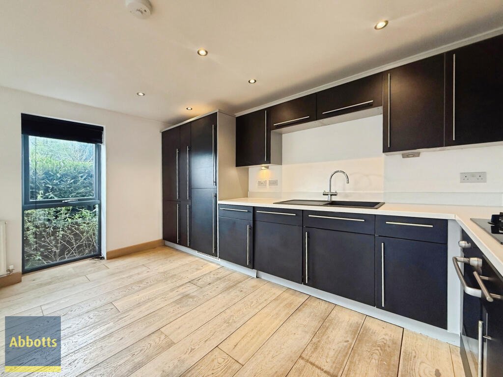 Arranged over two levels, the property features an open-plan reception room with large windows, providing good natural light and a flexible living and dining layout. The open-plan kitchen includes dedicated dining space and benefits from further natural light, creating a practical hub for everyday living.