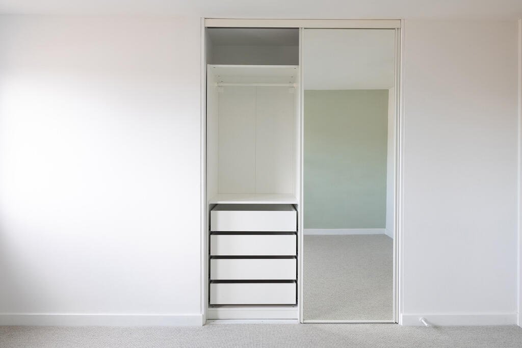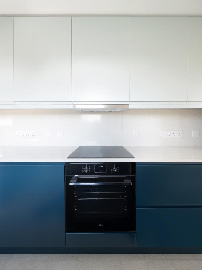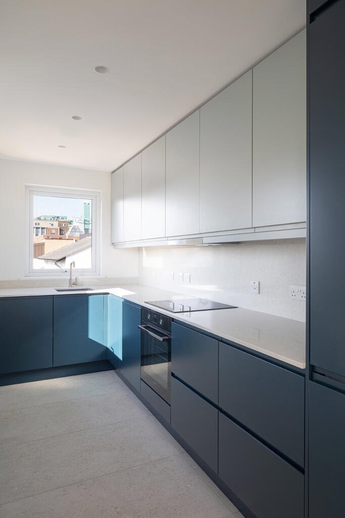 The bespoke kitchen pairs clean-lined, handless joinery with generous pull-out storage and high quality AEG appliances. Dual-aspect windows bring in natural light throughout the day, offering open views to the surrounding city.