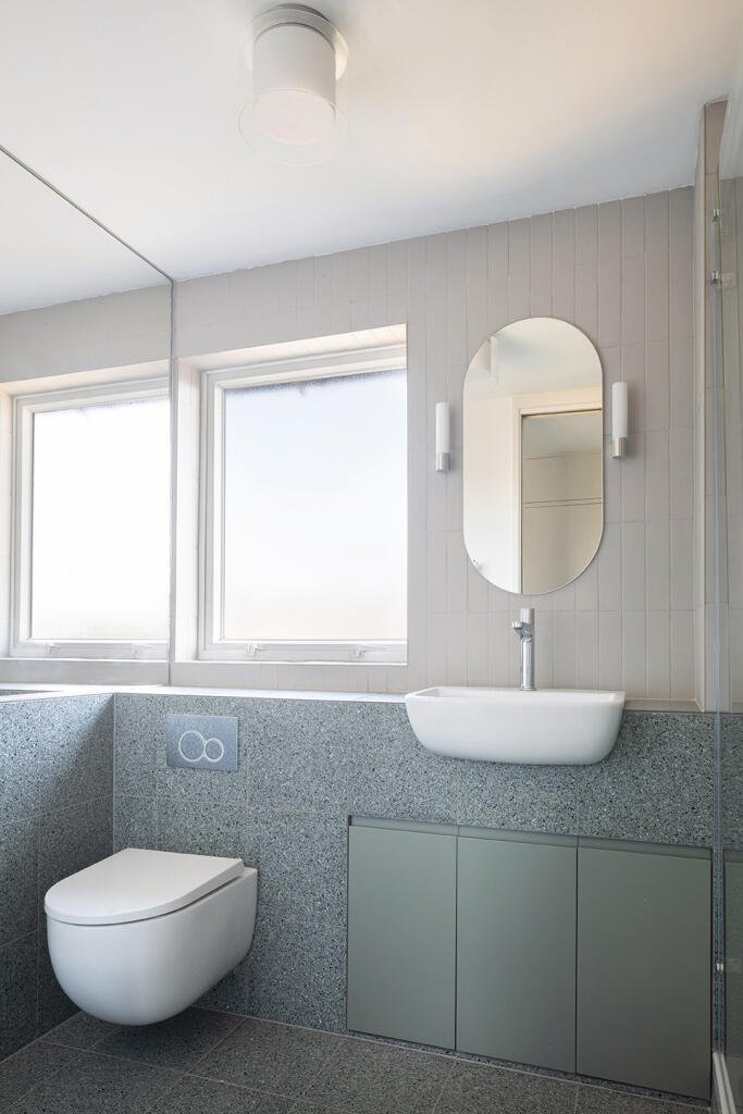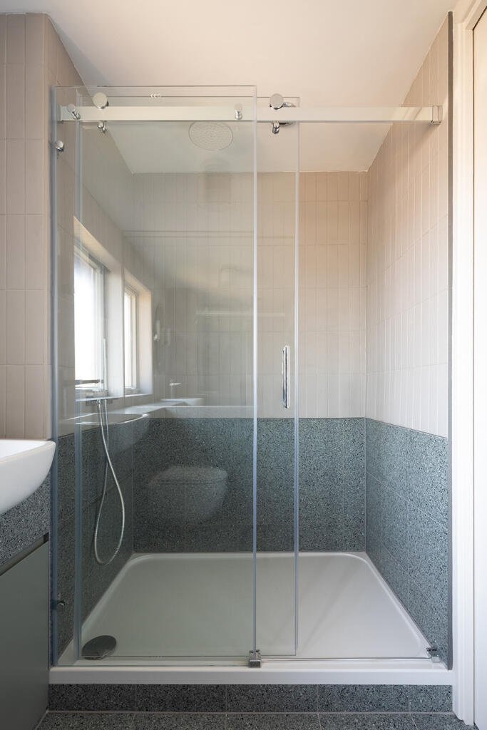 Two large double bedrooms are arranged for privacy and comfort, each with fitted wardrobes and blackout blinds. The fully tiled bathroom is finished in terrazzo and porcelain and includes a generous walk-in shower with excellent extract ventilation.