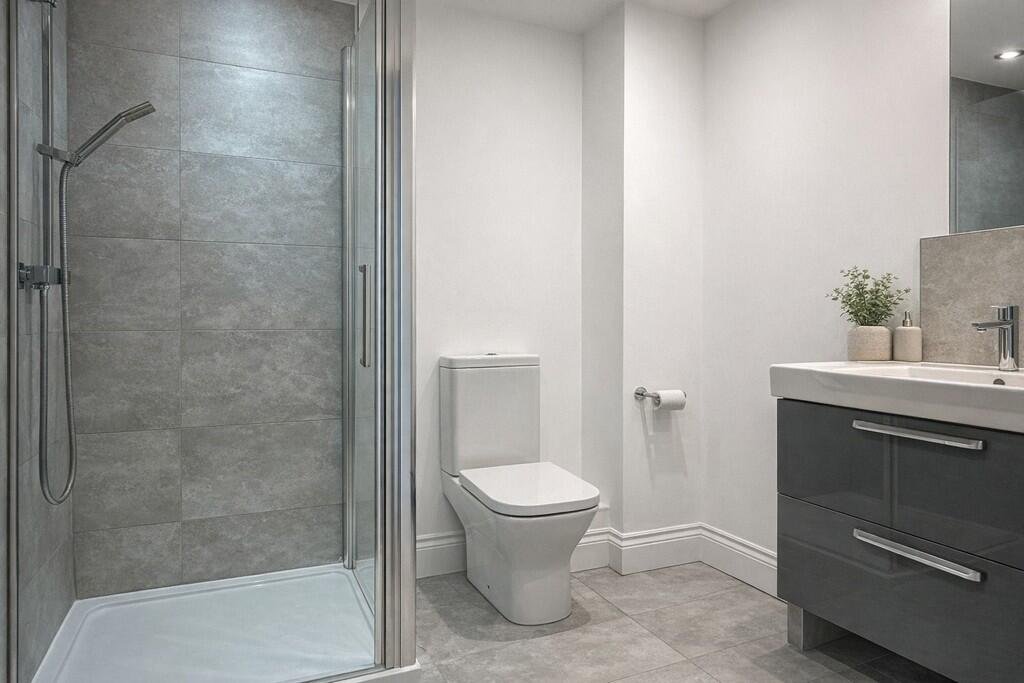 ENSUITE A modern en-suite with a shower cubicle, w/c, vanity unit with basic and mirror above.