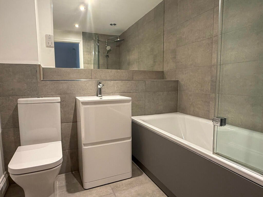 BATHROOM A stylish and modern bathroom, compromising w/c, basin with vanity unit and a bath with shower over.
