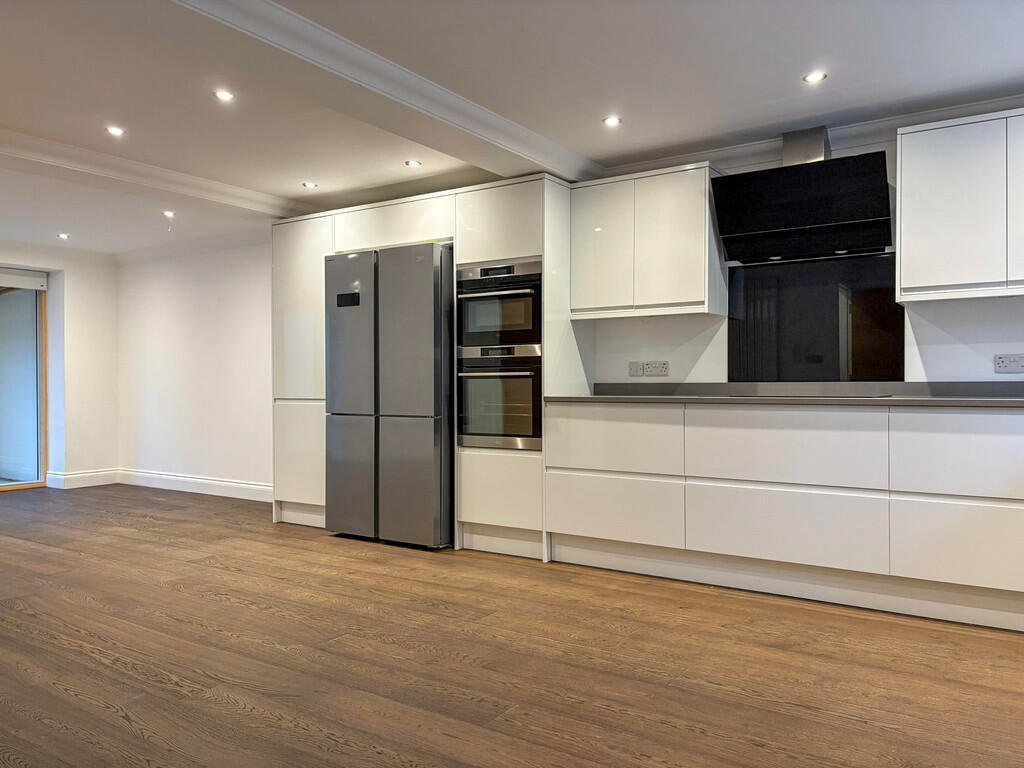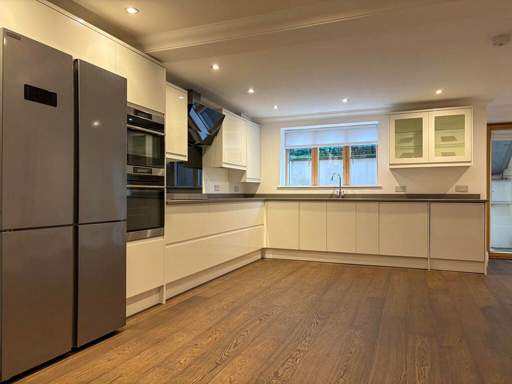 LOWER GROUND FLOOR KITCHEN/DINER A spacious room featuring modern cabinetry, sleek composite worktops, and high-quality integrated appliances, including an AEG hob, oven, grill, and an American-style fridge-freezer. Doors provide access to an enclosed external area.