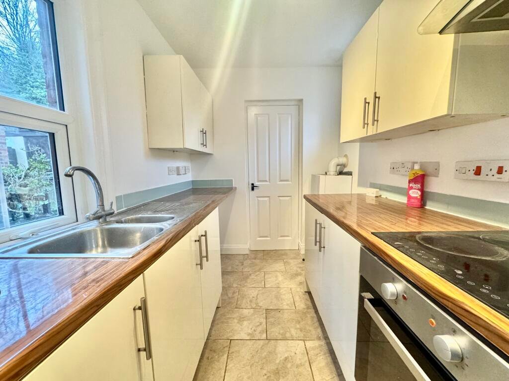 KitchenModern range of wall and base units, electric hob & electric oven with extractor, space for W/M, space for F/F, tiled floor, window to the side aspect.