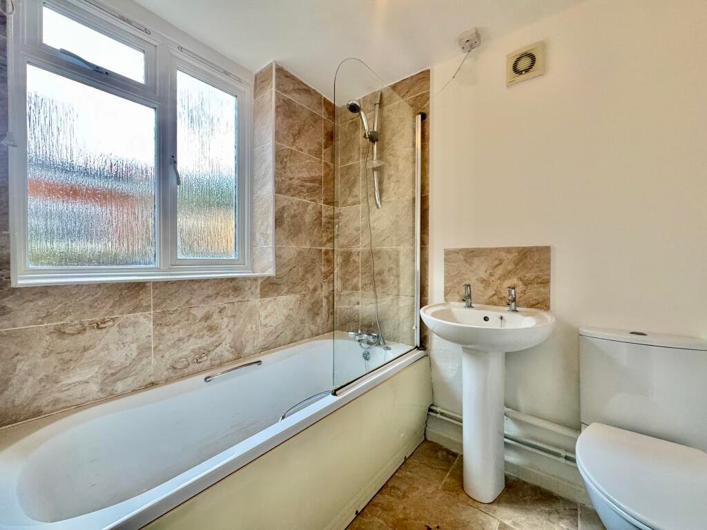 BathroomModern suite consisting of WC, basin, bath with shower attachment, tiled floor, heated towel rail, window to side aspect.