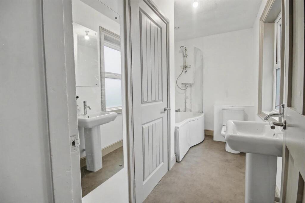 Ensuite – Modern ensuite bathroom. Complete with storage cupboard, P shape bath and white suite.