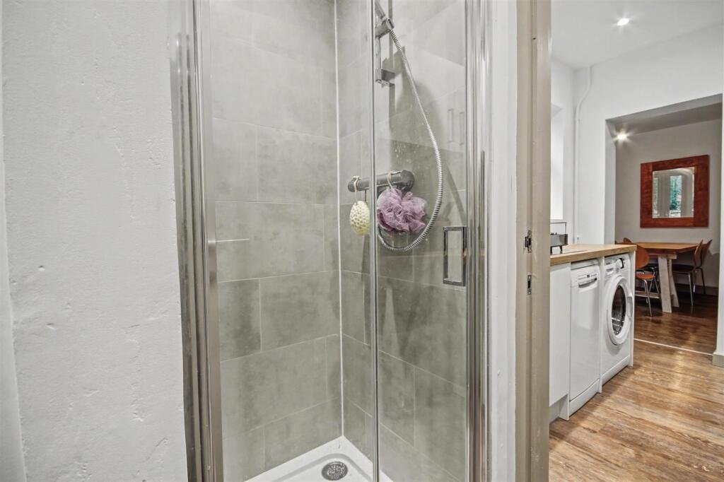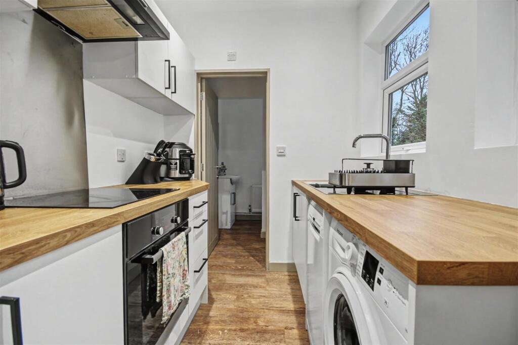 Kitchen – 1.86 x 2.40 (6’1″ x 7’10”) – Galley style kitchen, offering ample cupboard space. Washing machine and dishwasher, integrated hob and oven. Leads to the shower room.