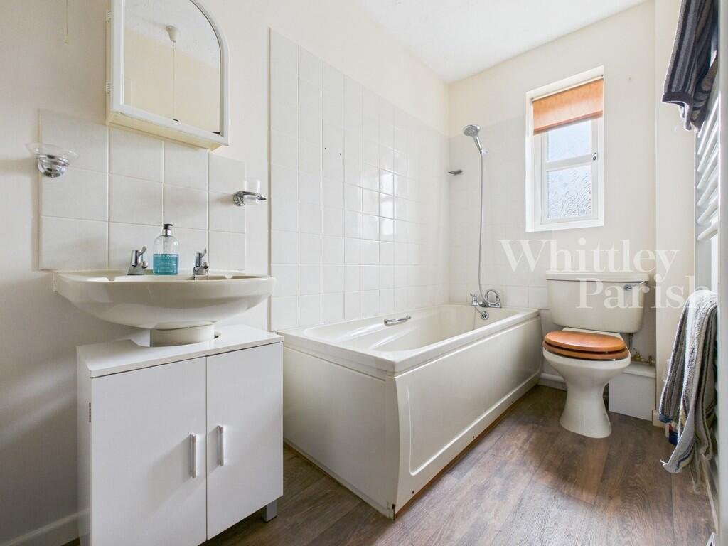 BATHROOM: Wood effect vinyl flooring, ceramic toilet and sink, bath with tile surround and shower above the bath, heated towel rail, Frosted front aspect window.Â