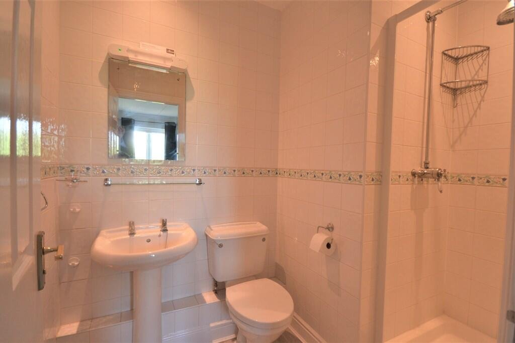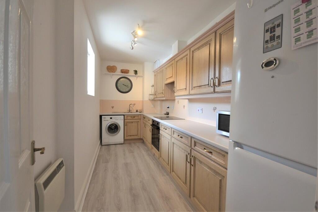 base and eye-level cabinetry, featuring an integrated oven and hob with extractor fan above, fridge/freezer, washing machine and a front-facing window. The principal bedroom benefits from a double fitted wardrobe and an en suite shower room comprising a shower cubicle, wash hand basin and WC. Two further bedrooms offer flexible accommodation, both with rear aspect windows, one with fitted storage. A family bathroom has a panelled bath with shower attachment over, wash hand basin, WC and heated towel rail.