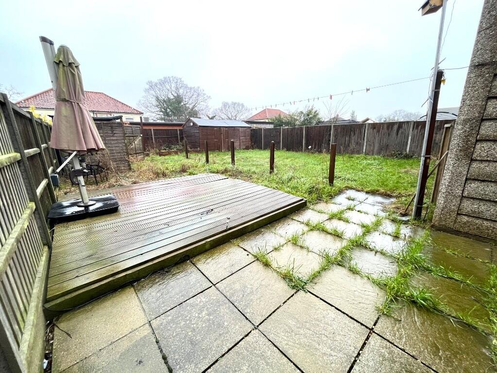 large and easy to maintain rear garden which is currently divided into two areas. On one side of this rear garden, patio, decking, shingle, and external storage, with the other side laid to lawn. The dividing fence can be removed.