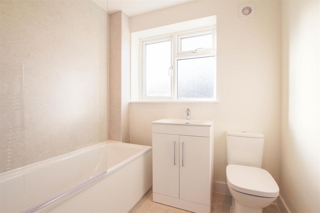 Bathroom – Comprising white three piece suite with panelled bath and shower over, sink with vanity unit below and W/C. Obscured window overlooks the front aspect.