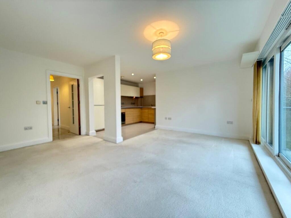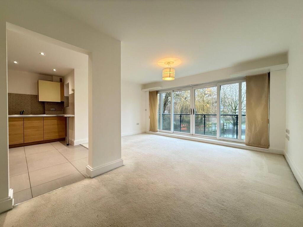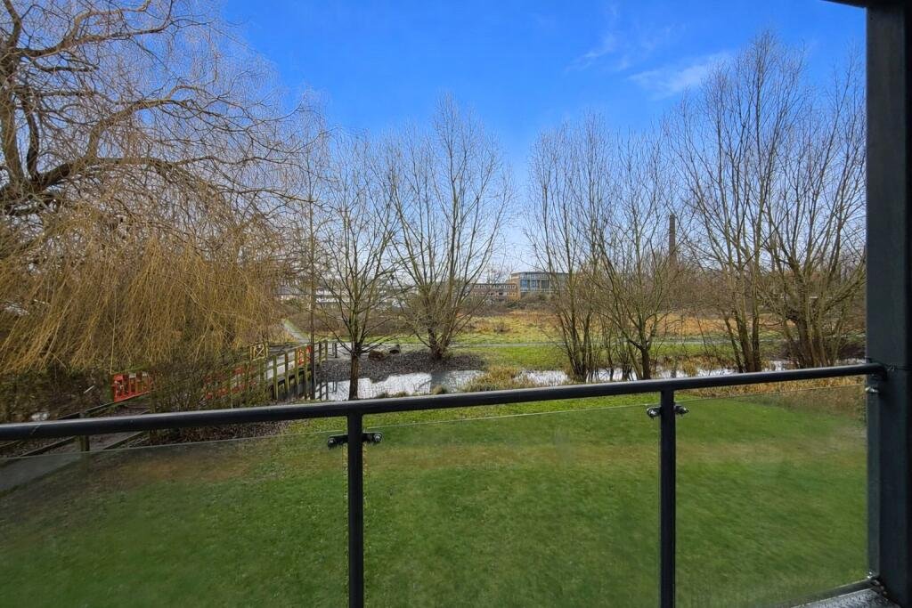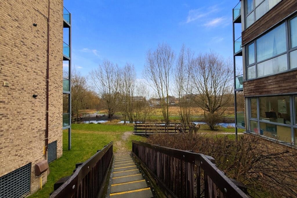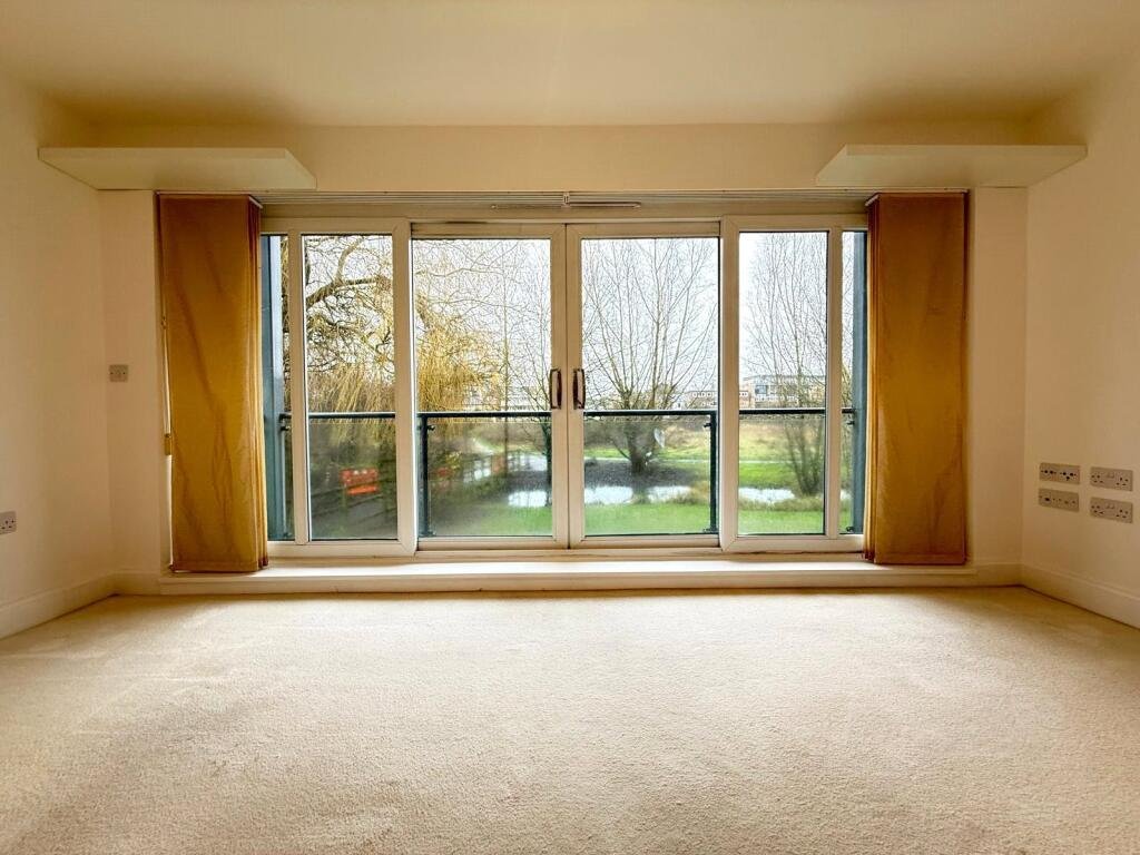 accommodation provides contemporary living and comprises a spacious living room with doors leading onto a spacious balcony overlooking an attractive green meadow and the River Cam. A principal bedroom with ensuite, a second bedroom, a family bathroom, and a modern kitchen fitted with integrated appliances including a dishwasher, washing machine, and fridge-freezer. Additional benefits include allocated parking and secure bike storage.