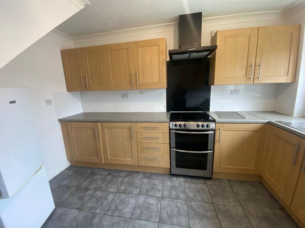 KITCHEN12′ Max x 8’4″ Max Window to the front aspect, tiled flooring, range of wall and base units, sink drainer unit with mixer tap, washing machine and dryer, fridge/freezer, oven and hob with cooker hood over