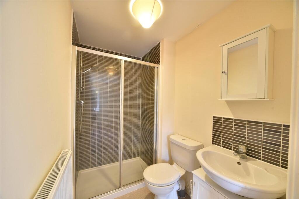 EN-SUITE:Suite comprising of low level WC, pedestal handbasin with unit below and double shower cubicle.