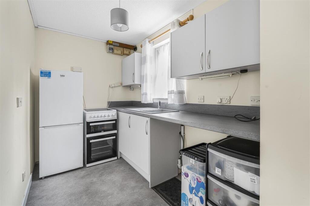 Kitchen – 2.84m x 1.88m (9’4″ x 6’2″) – Base and eye level units with worktop over, plumbing for washing machine, cooker, space for fridge/freezer, stainless steel sink, window to front.