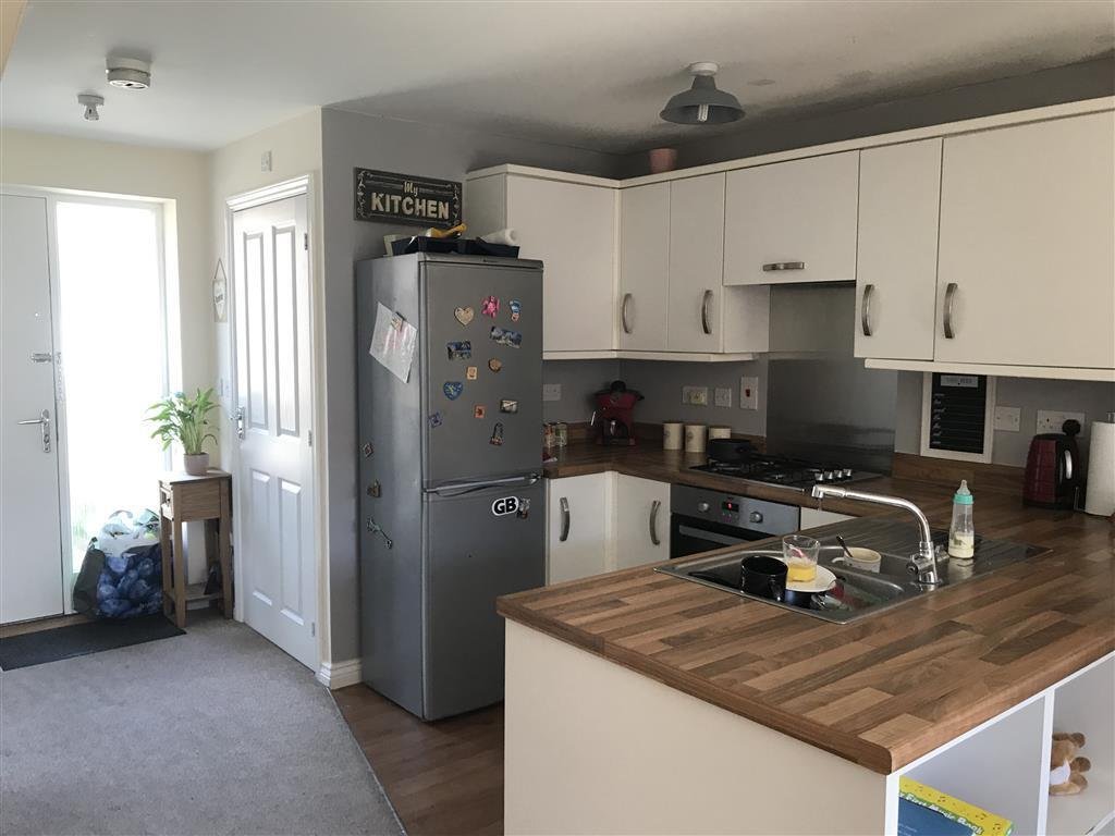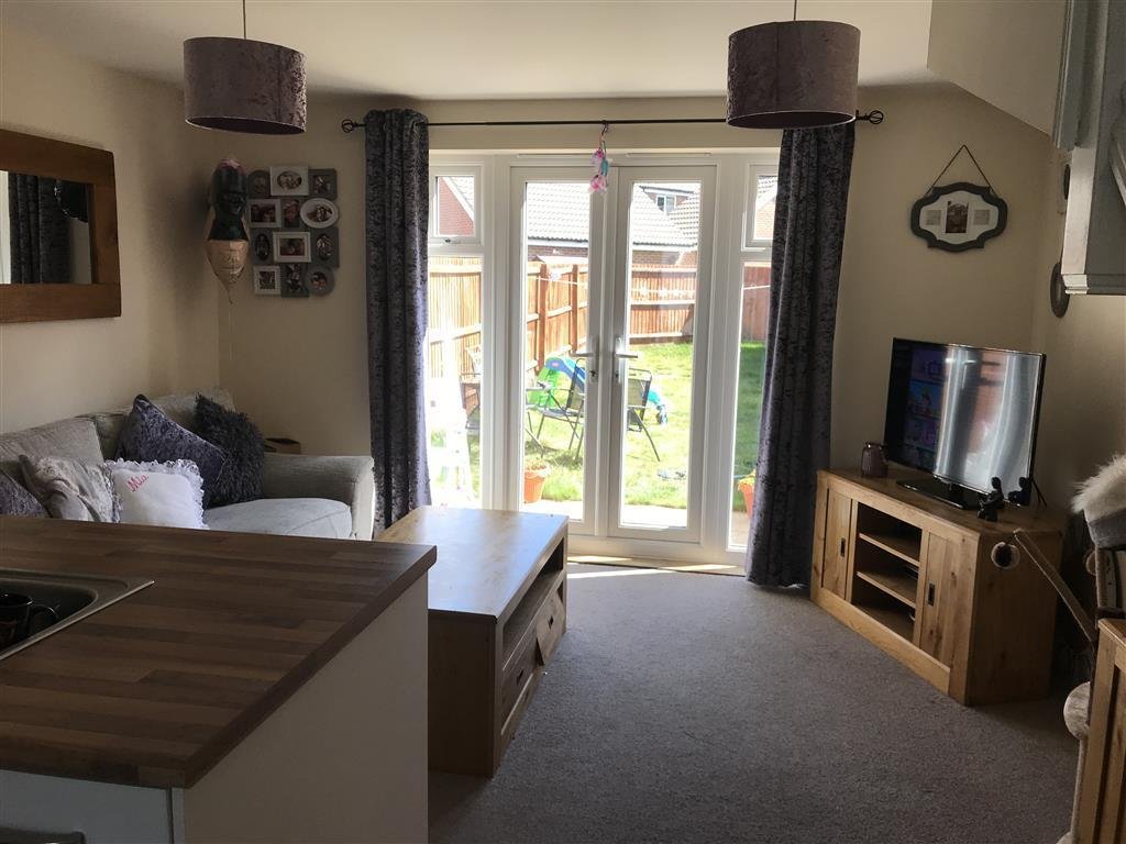 Open Plan Kitchen and Living RoomModern eye and base level units, integrated gas hob and fan oven, space for washing machine and fridge freezer. Living area carpeted throughout, French doors leading to rear garden.