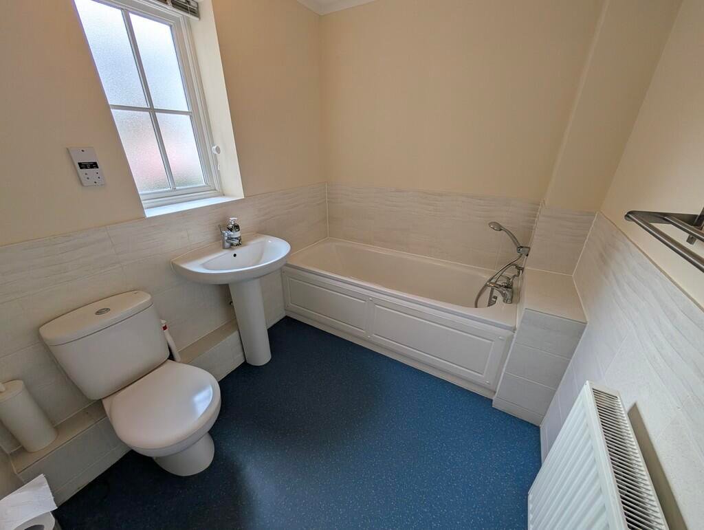 Family BathroomA generous sized bathroom comprising bath with hand-held shower over, WC, wash hand basin and opaque window.