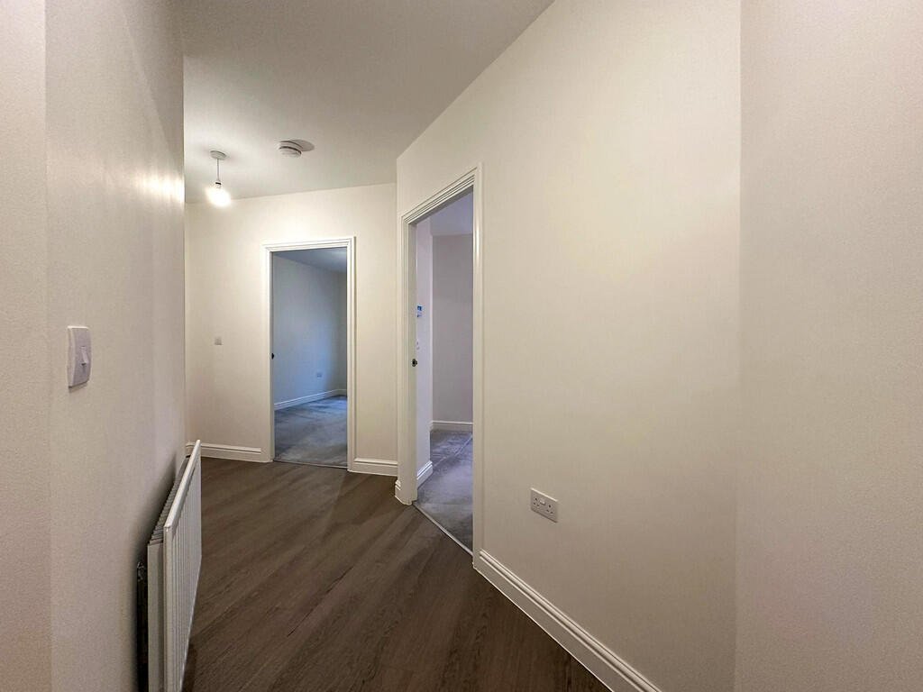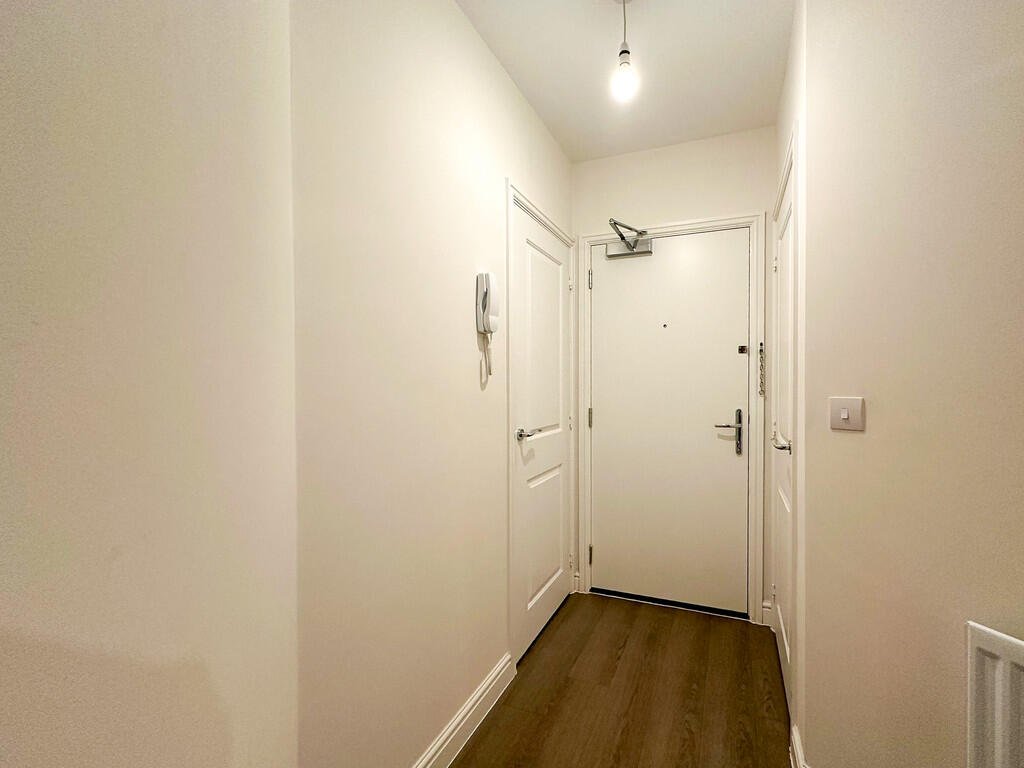 ENTRANCE HALLWAY A neutral entrance hall with wood laminate flooring. There is an intercom handset for the block door and a good size storage cupboard.Â