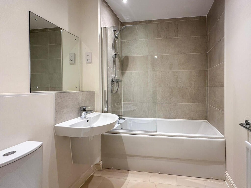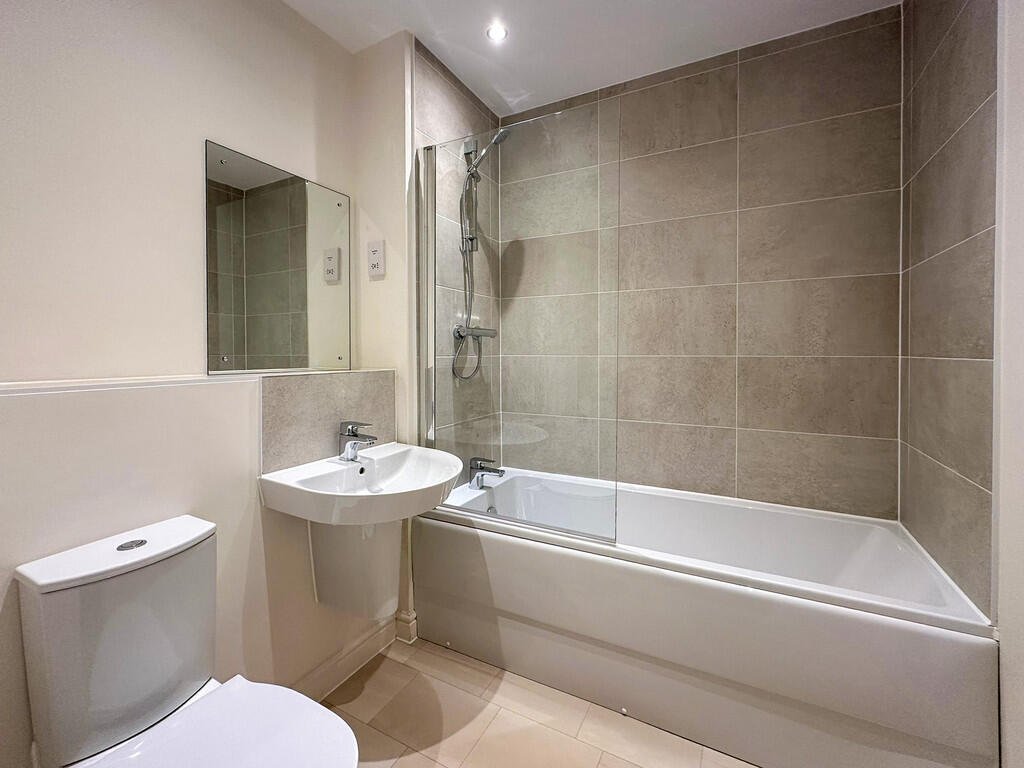 BATHROOM A modern family bathroom with white suite and feature tiles. Bath with shower over, basin, mirror and wc.Â