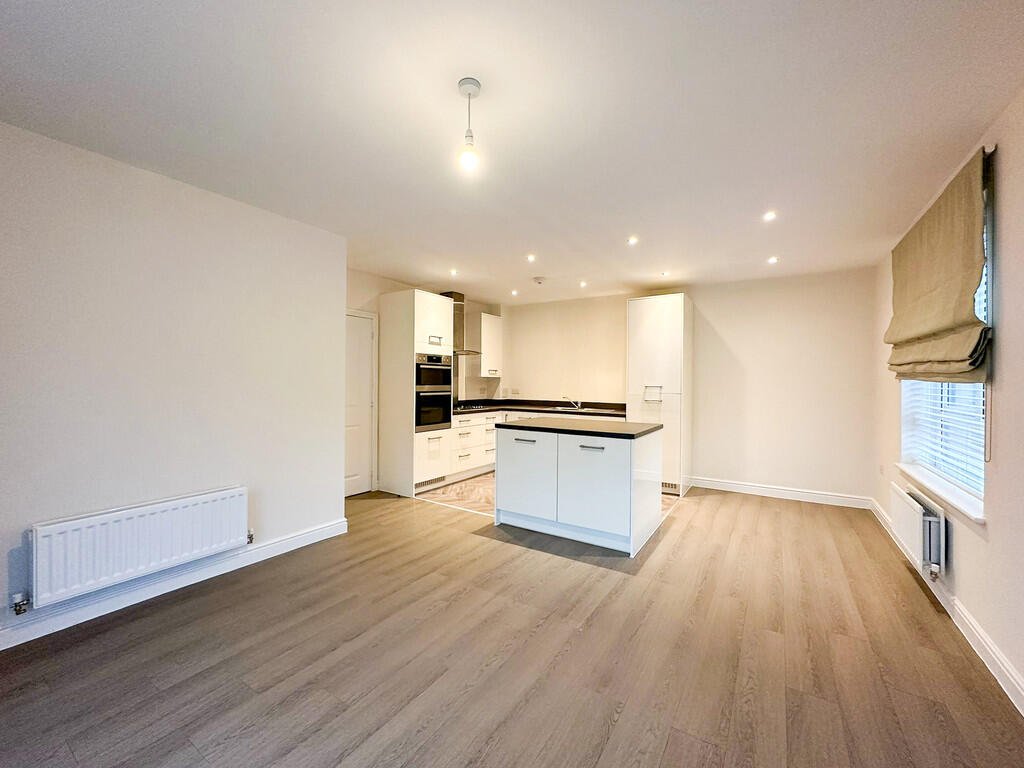 KITCHEN/LIVING SPACE A bright and spacious open planned kitchen living space with island style units that can double as a breakfast bar. With modern white high gloss units and integrated appliances including a fridge freezer, washer dryer, dishwasher and a double oven. With wood laminate flooring and large French doors leading out onto the private patio area.Â