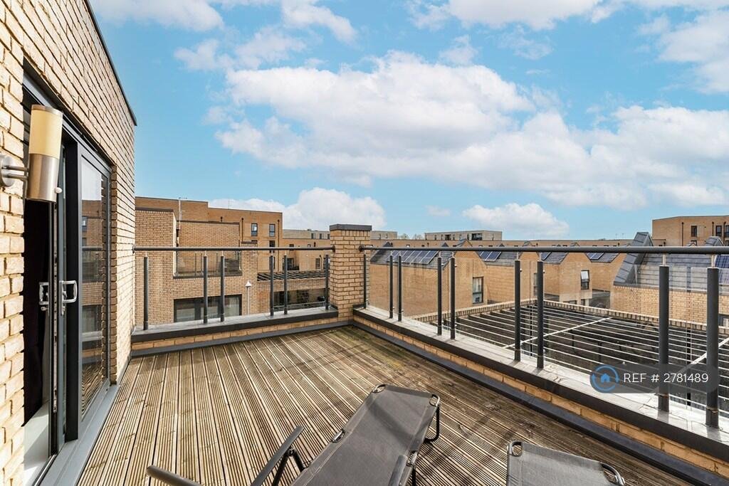 and wash basin. A generously sized family room/lounge which leads out to a large decked roof terrace with views over the quiet residential area.