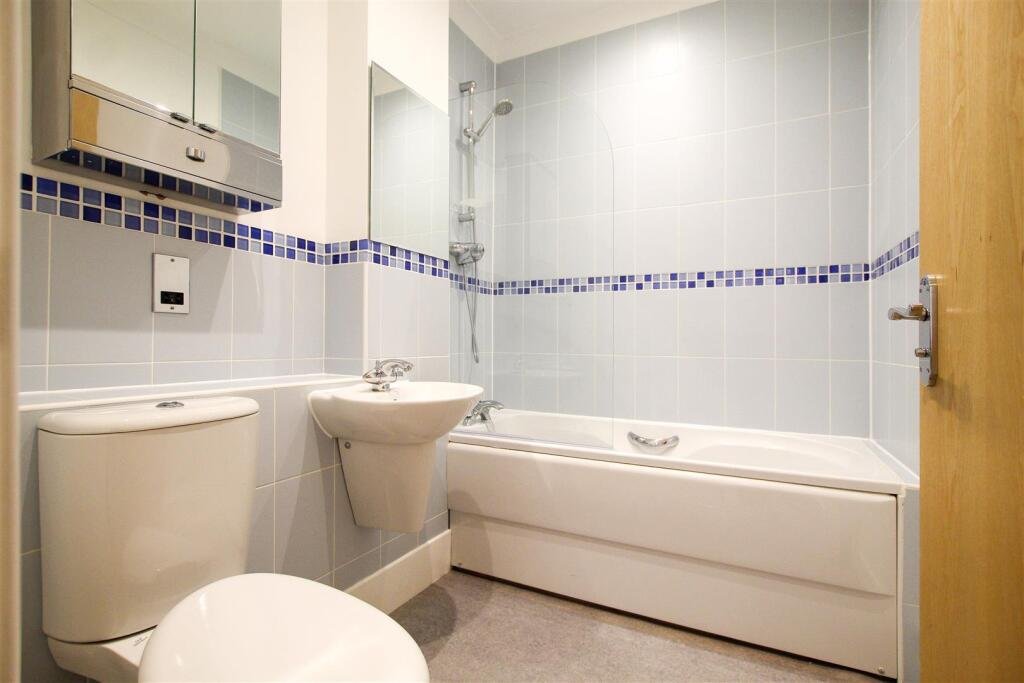 Bathroom – shower over bath with glass shower screen, low level wc, wash basin, mirrored cabinet, wall mirror and heated towel rail.