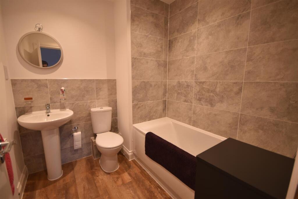 Bathroom – White suite comprising bath with shower, hand basin and WC