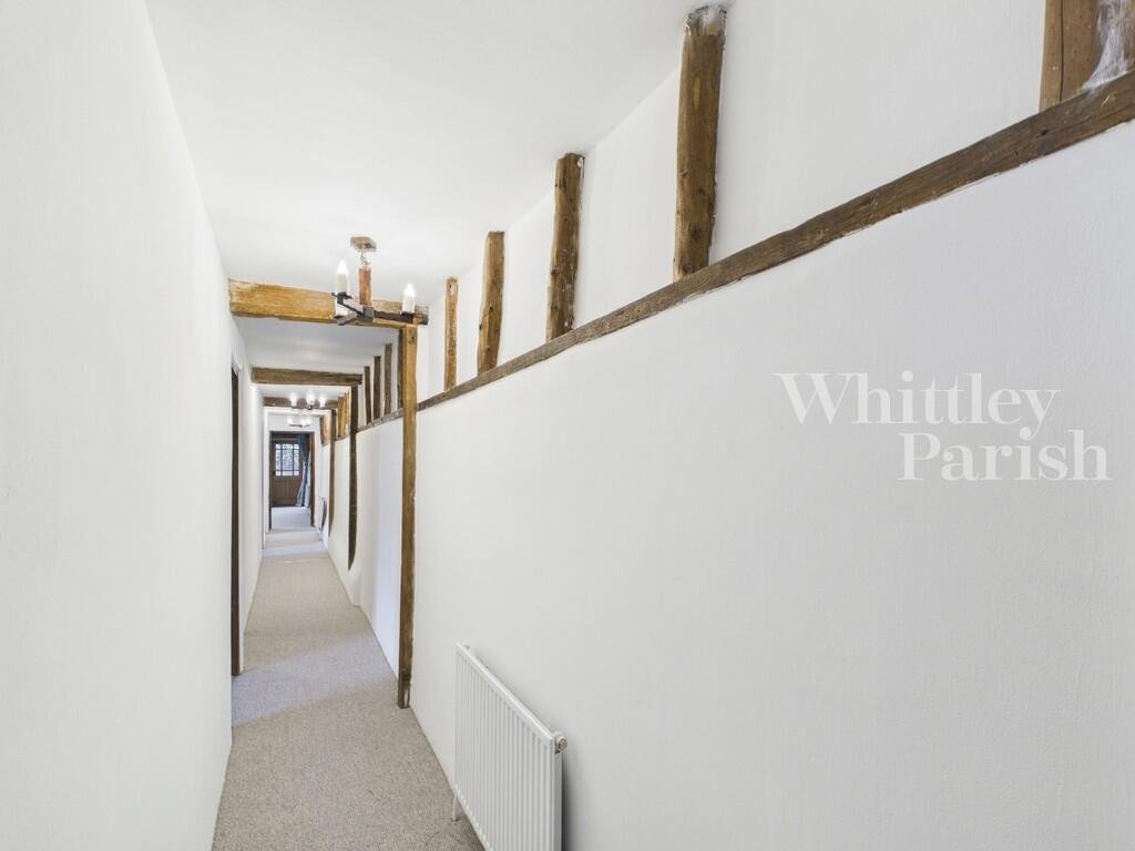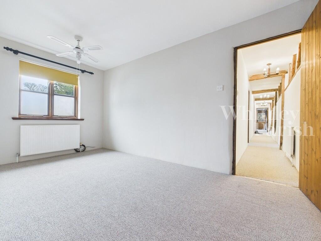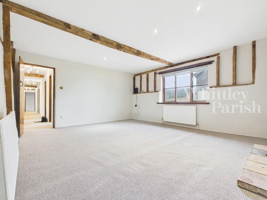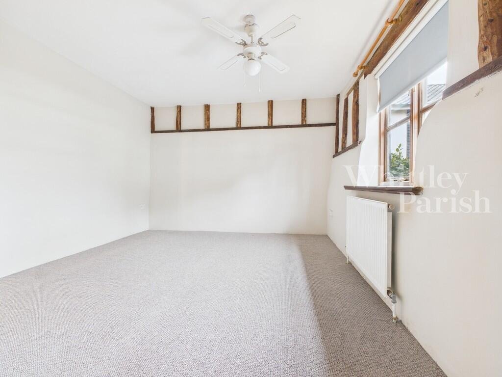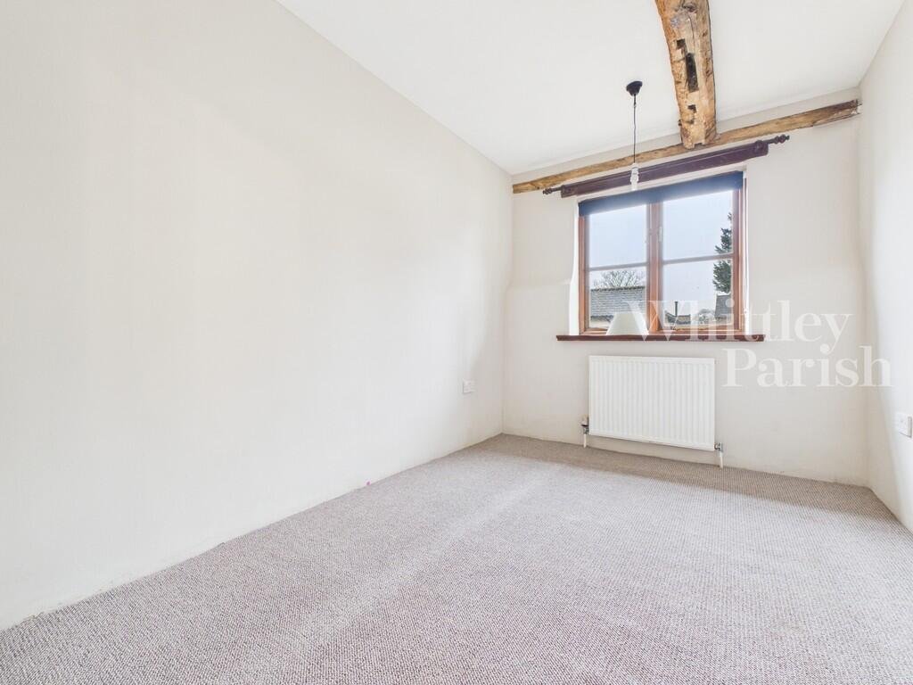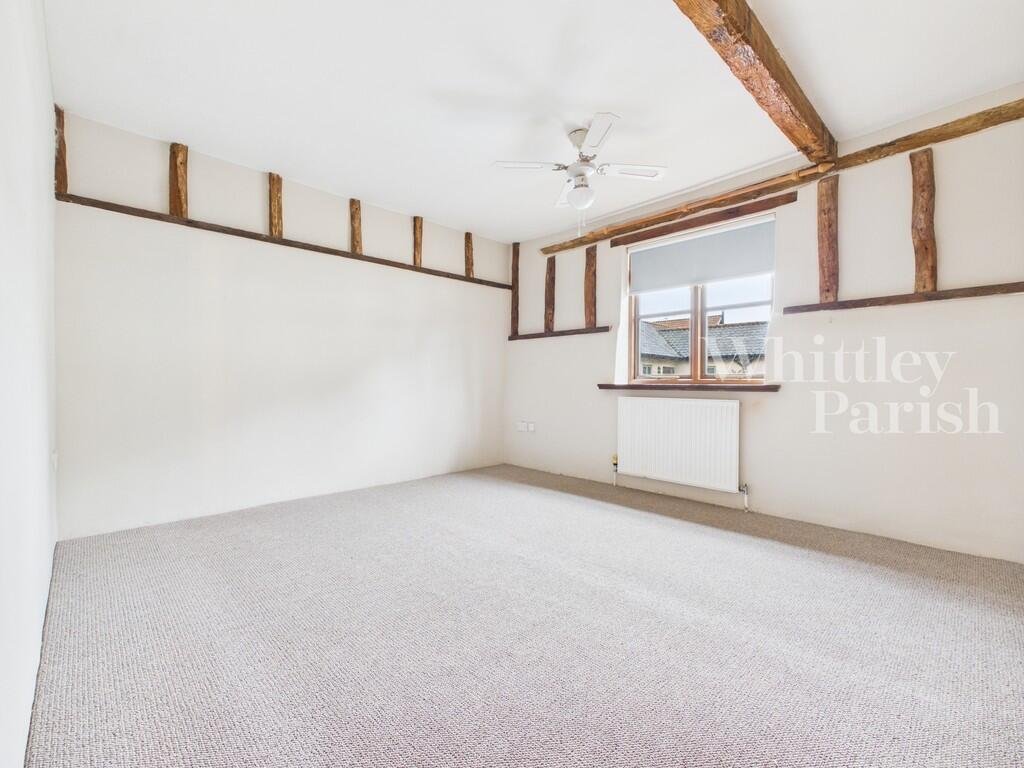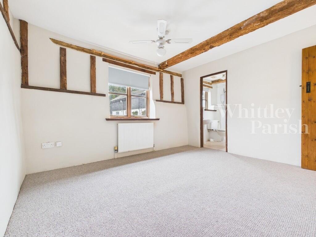 BEDROOM ONE Carpet flooring, front aspect window, radiator, exposed beams.Â