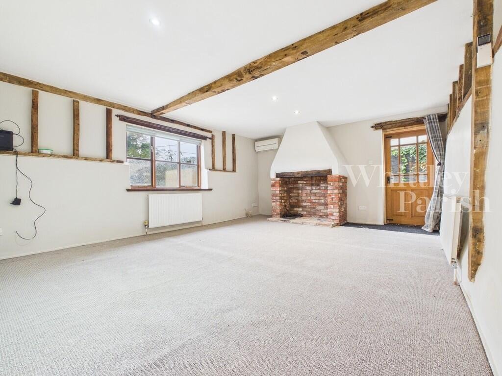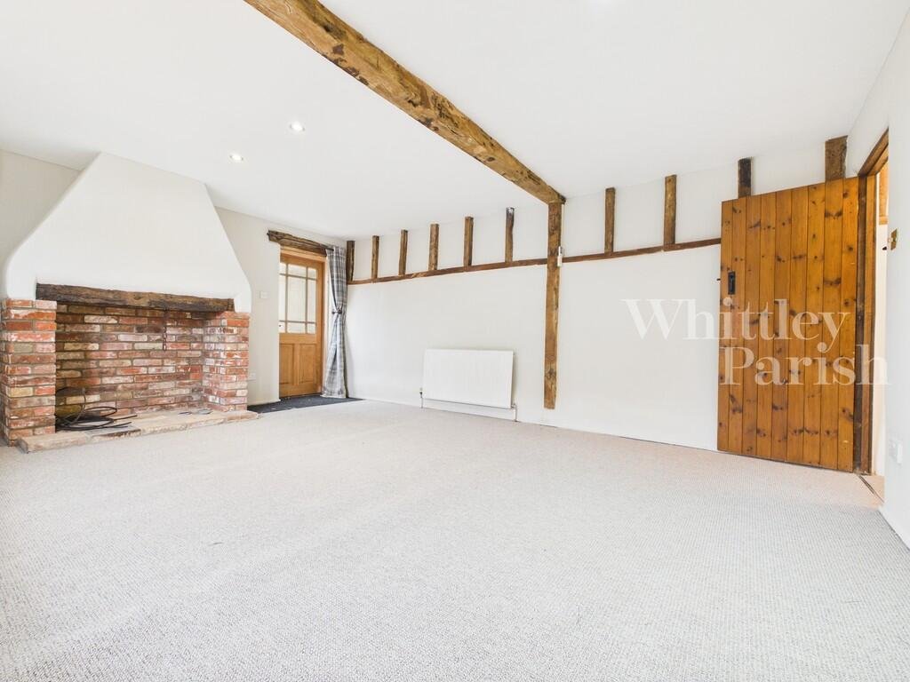 LOUNGE Brand new carpet flooring, red brick decorative fireplace, exposed beams, front aspect window, rear door, radiator.Â