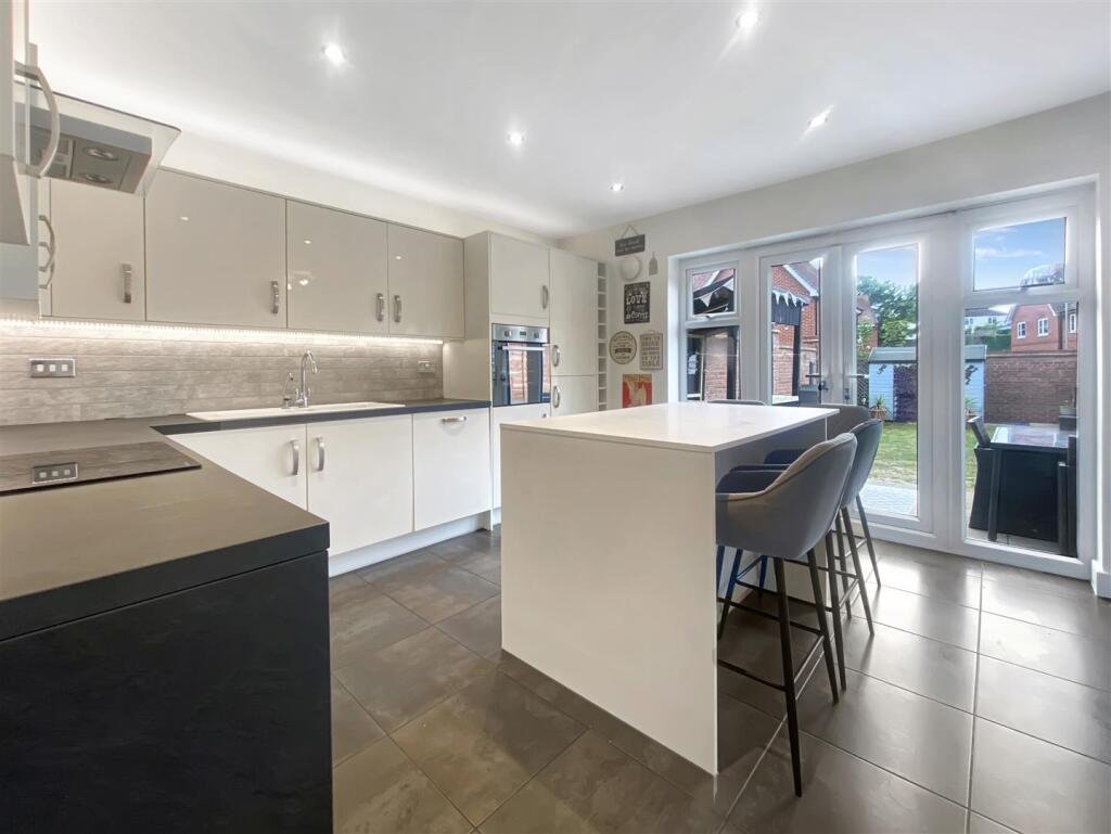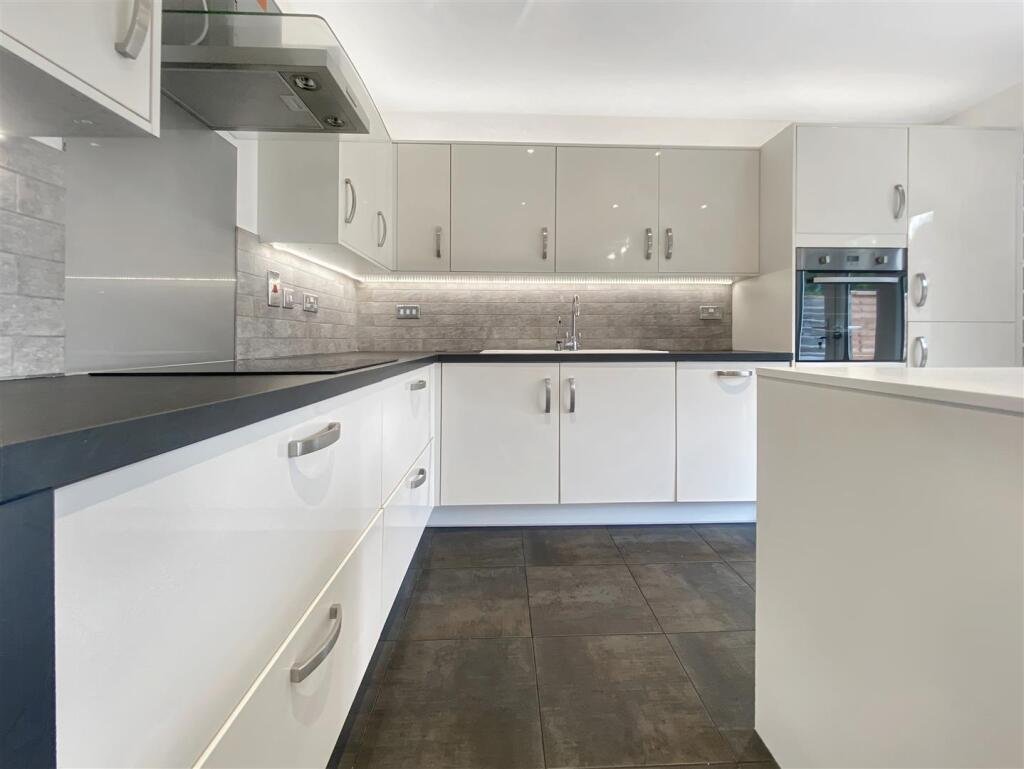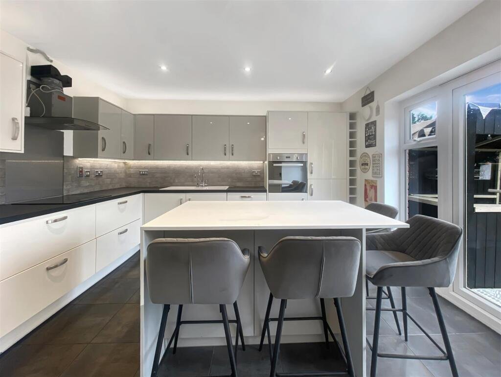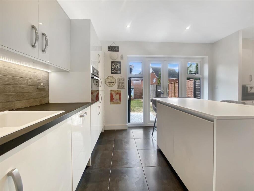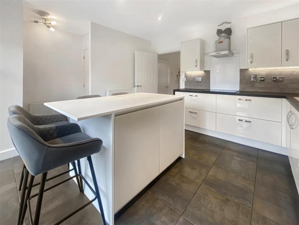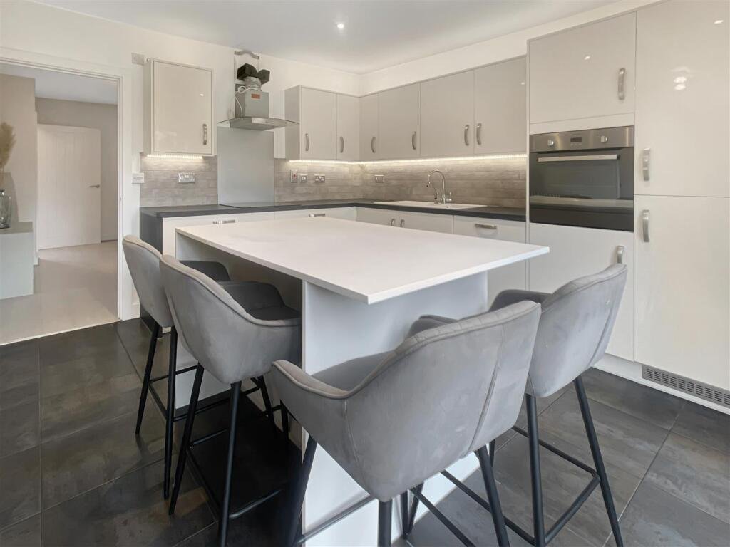 halogen hob, extractor, oven, 1.5 bowl sink, integrated fridge/freezer and dishwasher, and a central island with breakfast bar and wine rack. French doors open onto the rear garden. There’s also a utility corner with space and plumbing for a washing machine, and the boiler is housed in a matching unit. A downstairs WC completes the ground floor.