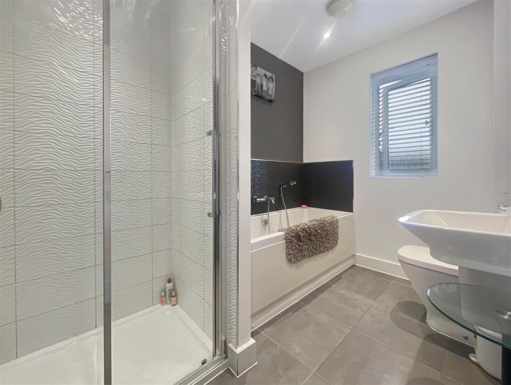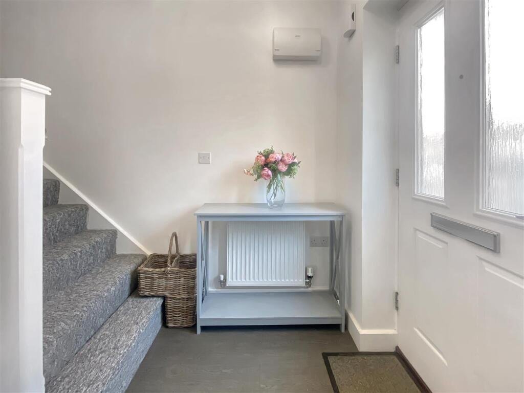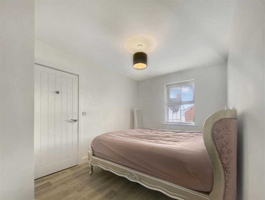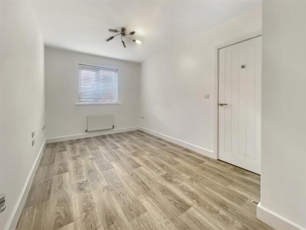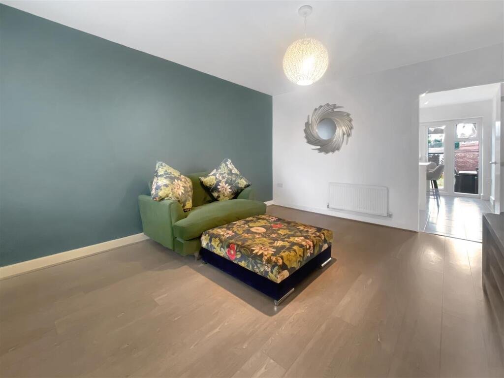 The first floor offers two double bedrooms, a family bathroom with a four-piece suite including enclosed shower and bath, and an airing cupboard. Bedroom two overlooks the rear garden, while bedroom three has space for wardrobes.