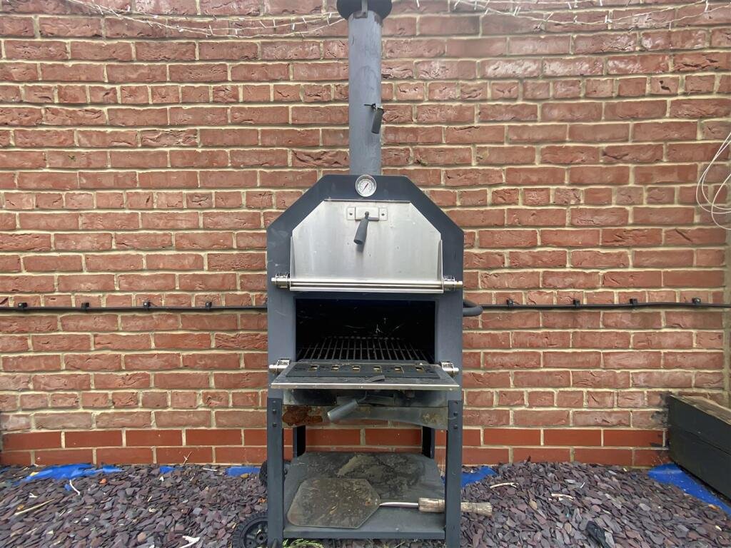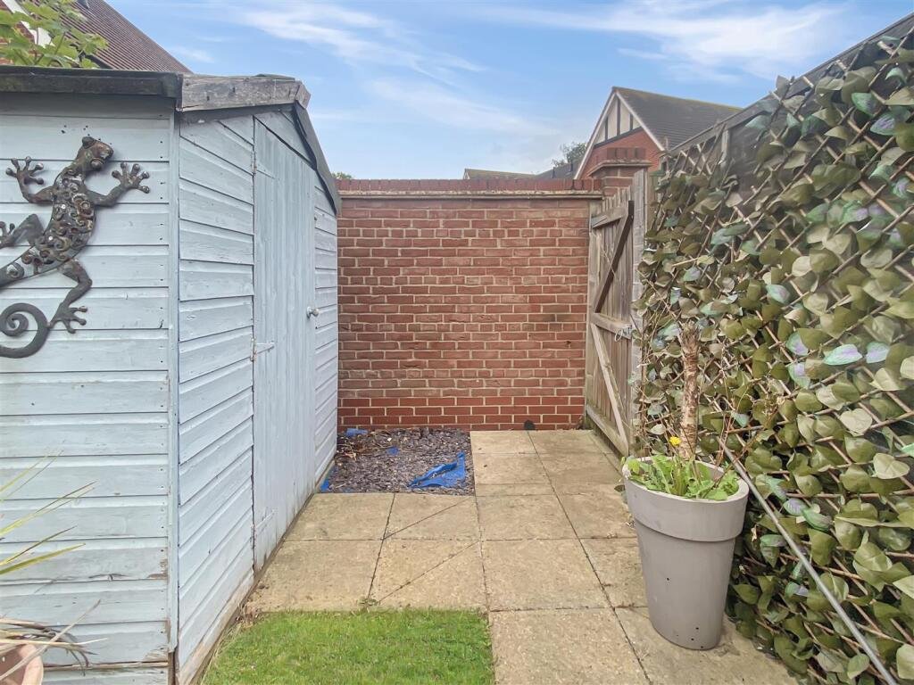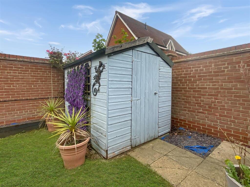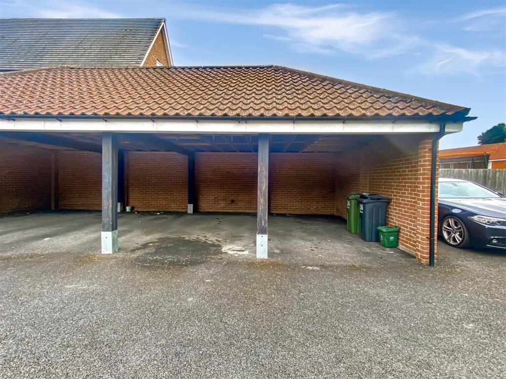 Outside, the front offers visitor parking and access to the entrance. The south-facing rear garden features a patio with a timber-framed bar, lawn, and path leading to the back gate. Boundaries include a brick wall, panel fencing, and bamboo screening. A powered garden shed is included. A short walk away is a double carport with two allocated spaces.