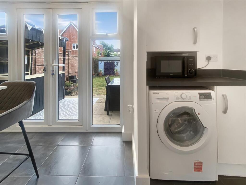 The property is entered via a composite front door into a hallway with stairs to the first floor and a door to the lounge. The generous living room features a front-facing window, quality laminate flooring, and an understairs cupboard. A door leads to the modern kitchen/diner, fitted with gloss wall and base units,