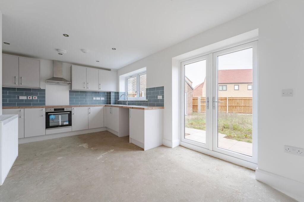 To the rear, the kitchen diner spans the width of the house and creates a sociable, open space with direct access to the garden through French doors. The kitchen itself is fitted with modern white cabinetry, wood-effect worktops and blue-grey metro-style tiled splashbacks. Integrated appliances include a Candy electric oven, ceramic hob with stainless steel extractor hood above, and a tall integrated fridge freezer. There is also a stainless steel sink positioned beneath a rear-facing window. Recessed ceiling lighting adds a smart finish, while the dining area offers plenty of space for a family table and seating.