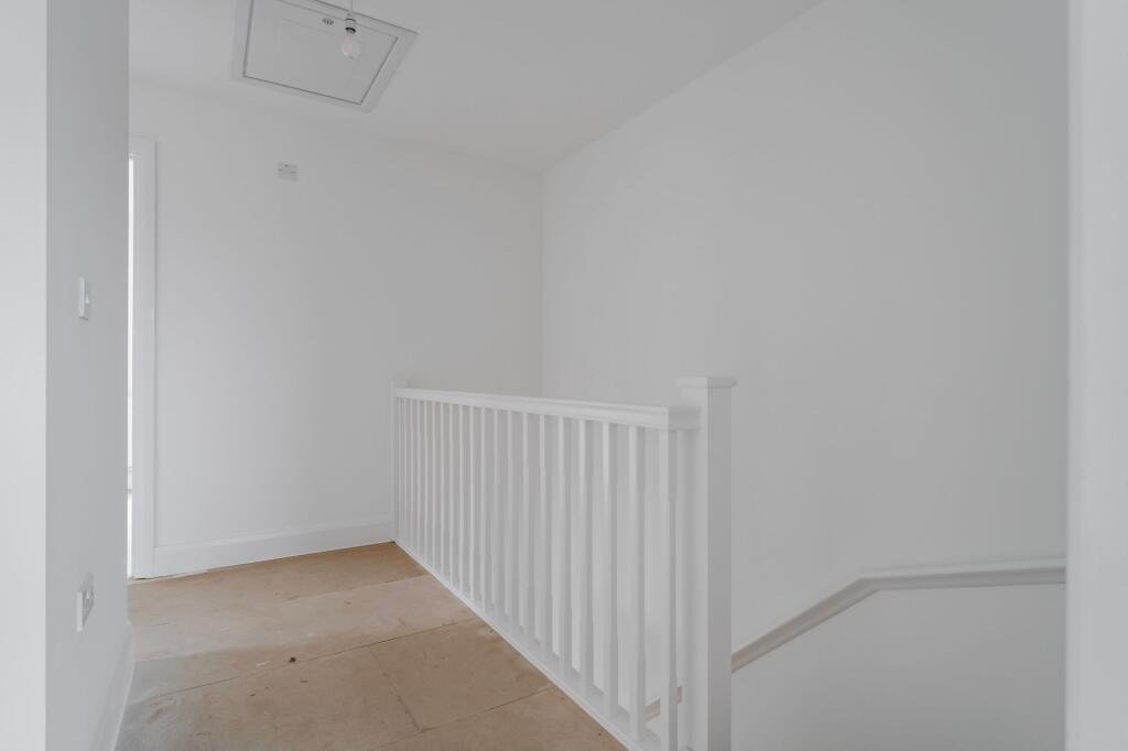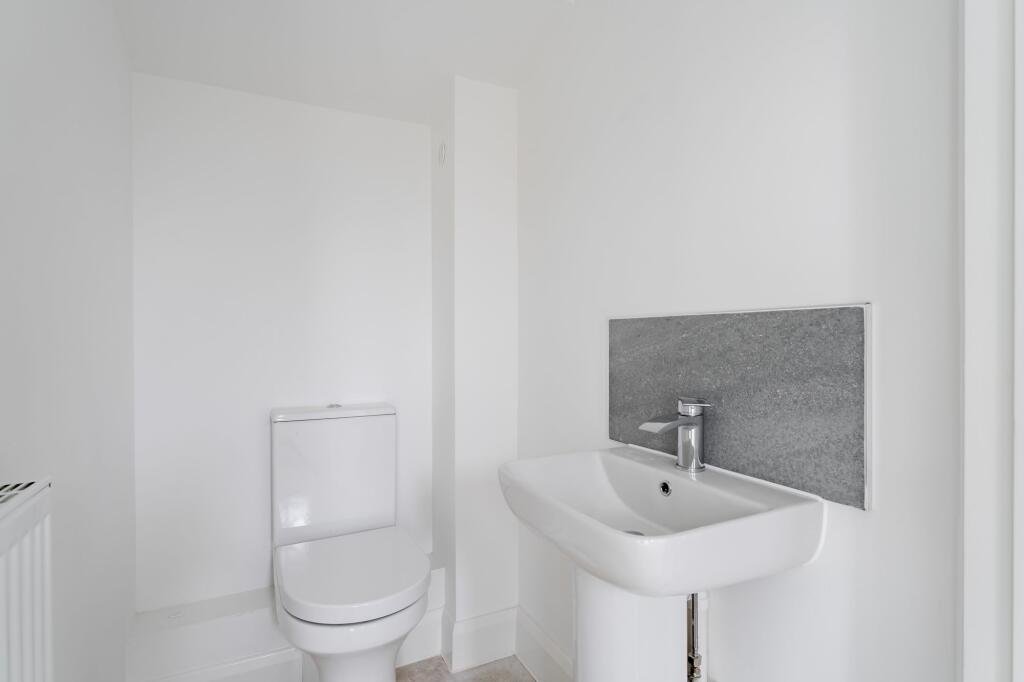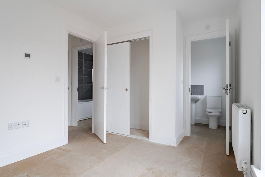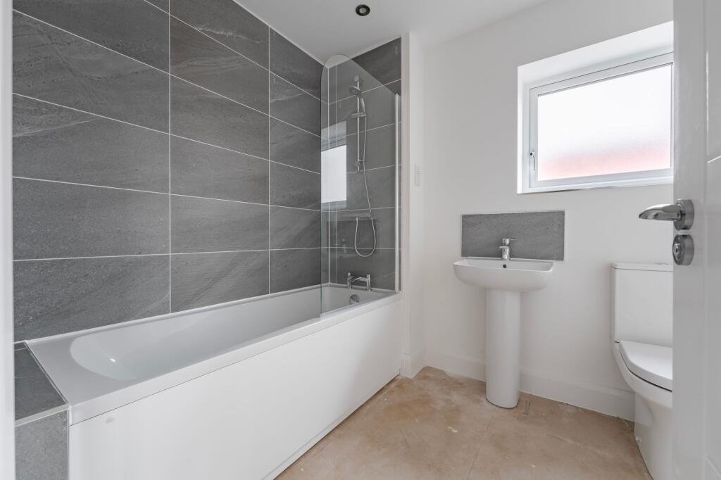Upstairs, the landing provides further storage and leads to three bedrooms. The principal bedroom benefits from a built-in wardrobe and a private en suite shower room, fitted with a glazed shower enclosure and grey tiled surround, pedestal basin and WC. The remaining bedrooms are well proportioned and served by a family bathroom comprising a panelled bath with a shower over and a glass screen, contemporary grey tiling, a pedestal basin and WC. All rooms are presented with neutral décor, white skirting and internal doors, creating a bright and cohesive feel throughout.