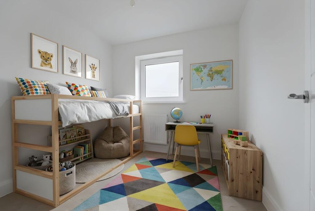 You enter into a welcoming entrance hall, complete with useful built-in storage and a ground-floor WC fitted with a white suite and pedestal basin. From here, the lounge sits to the front of the property, centred around a bay window that draws in excellent natural light and enhances the sense of space. The room feels generous and practical, with additional storage and ample wall space for flexible furniture arrangements.